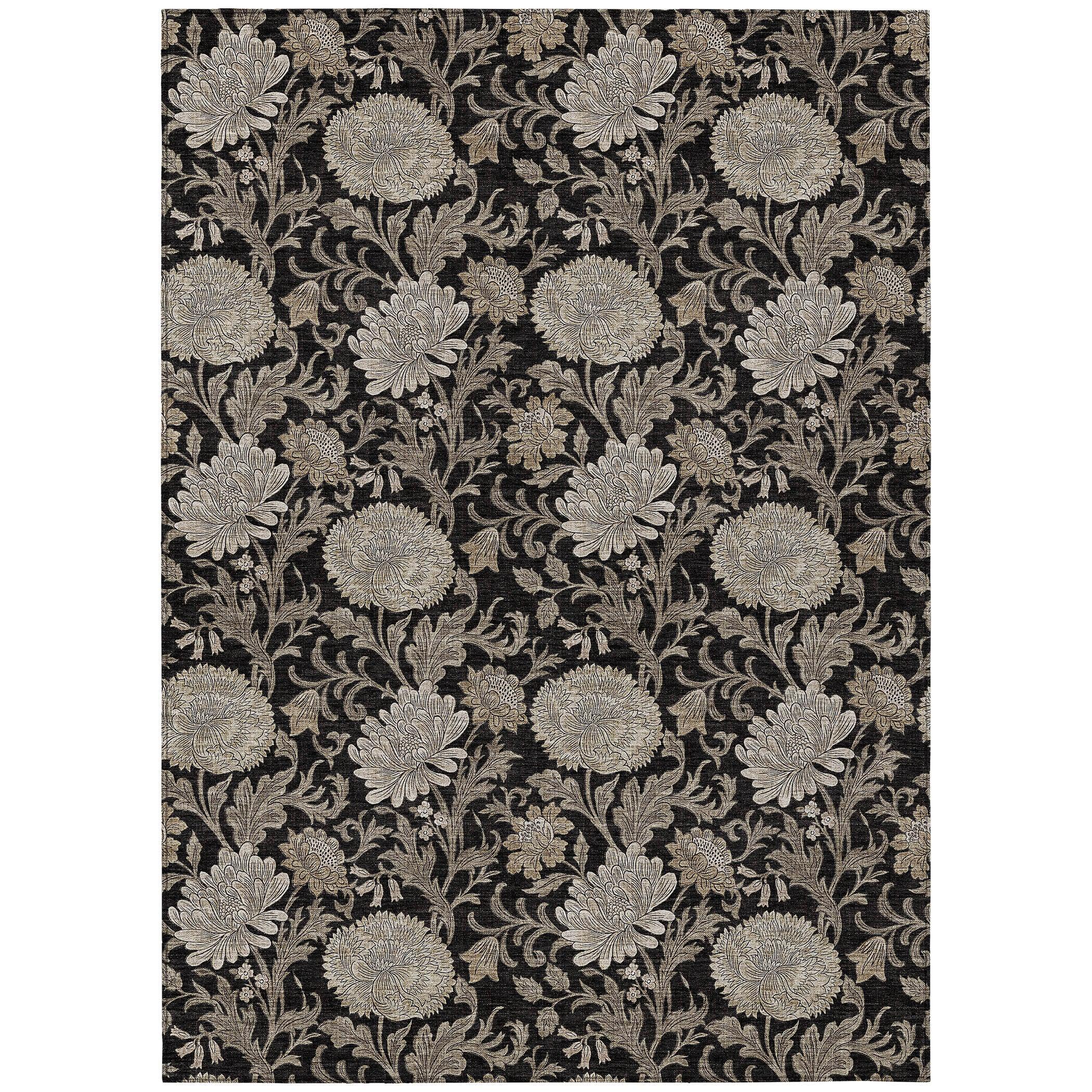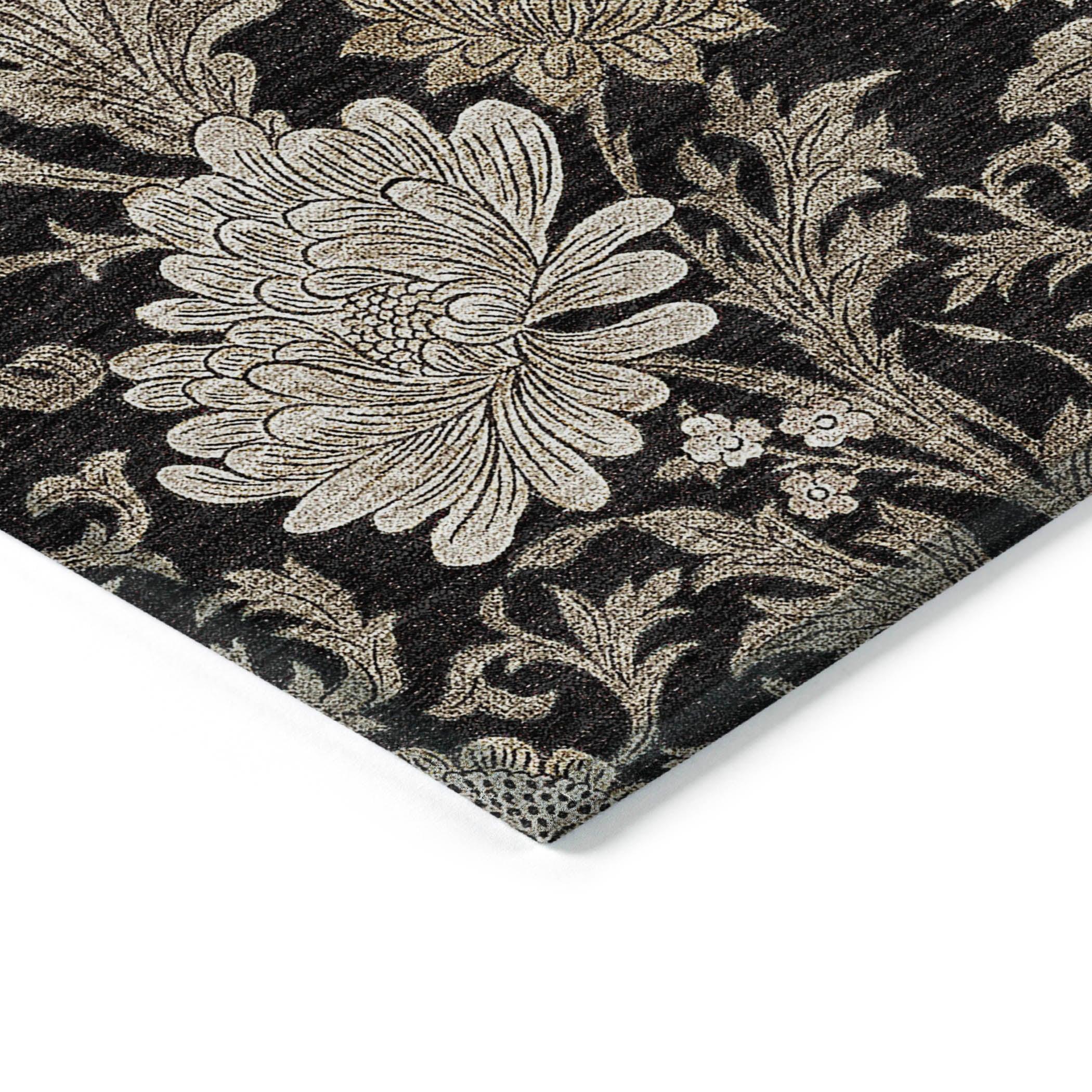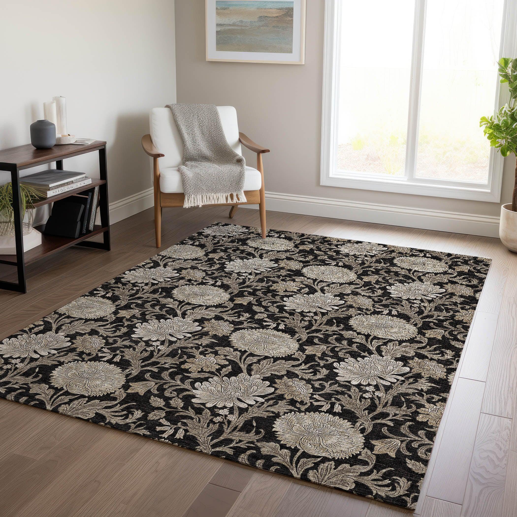 Chantille ACN677 Black area rug, a stunning addition to your decor. Featuring an intricate allover floral pattern with flowing leaf motifs, this rug embodies transitional floral design that effortlessly elevates any space. Not just a feast for the eyes, this rug is also practical - UV-stabilized for indoor or outdoor use and boasting an ultra-thin construction with a built-in non-skid backing to eliminate the need for a separate rug pad.