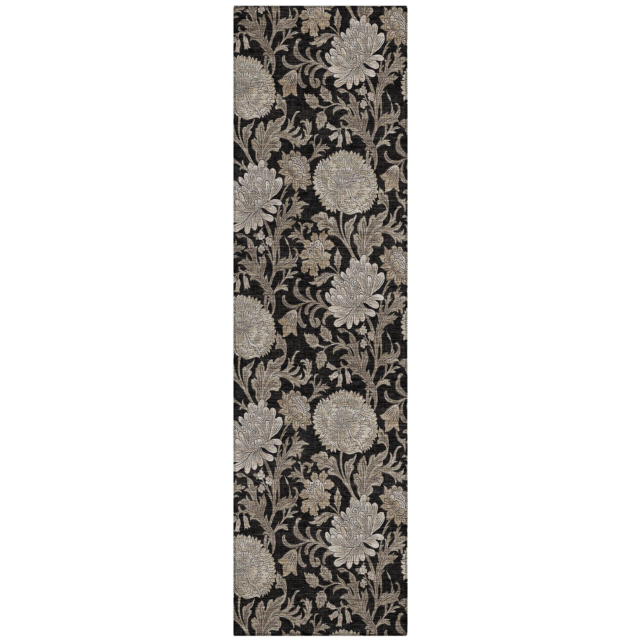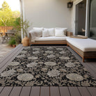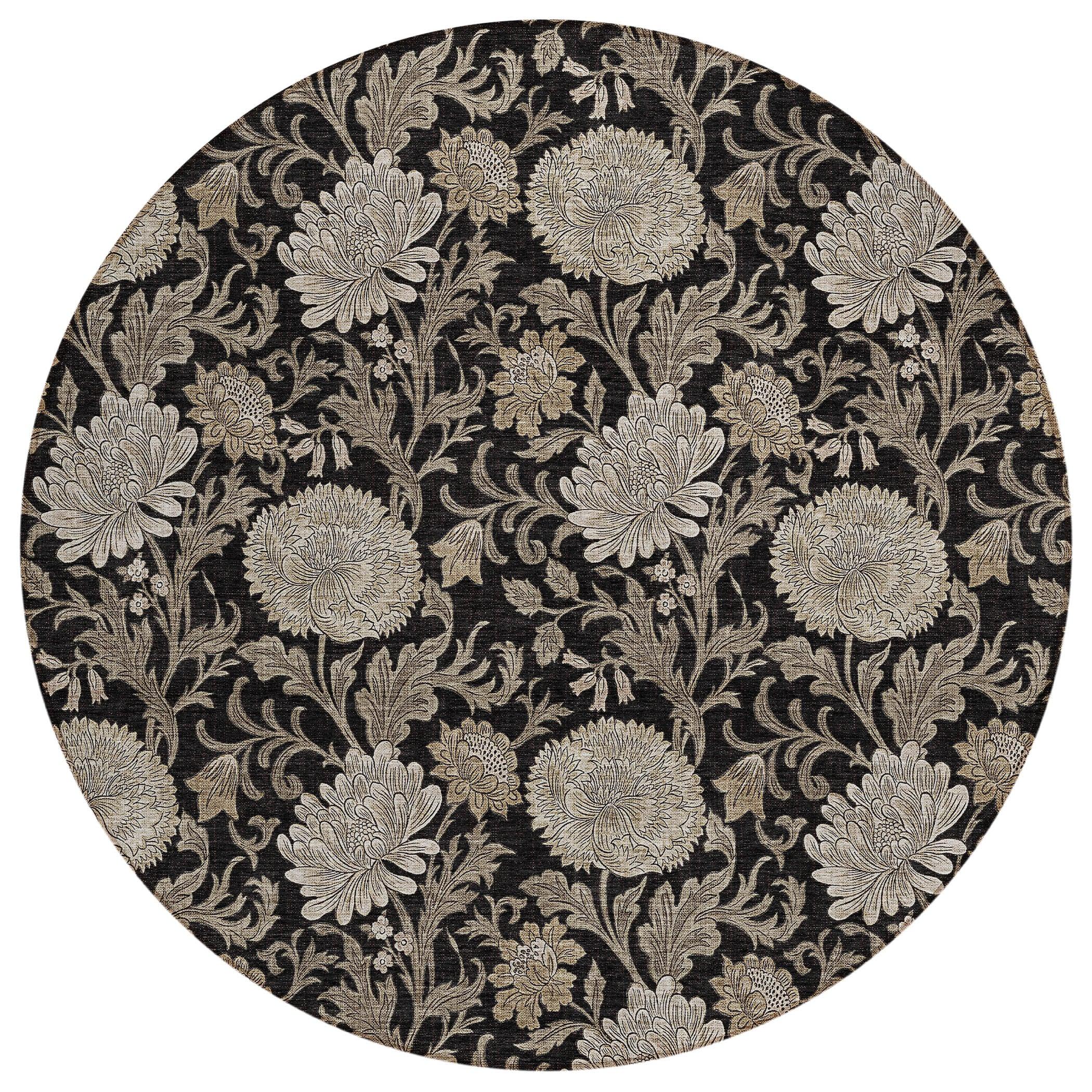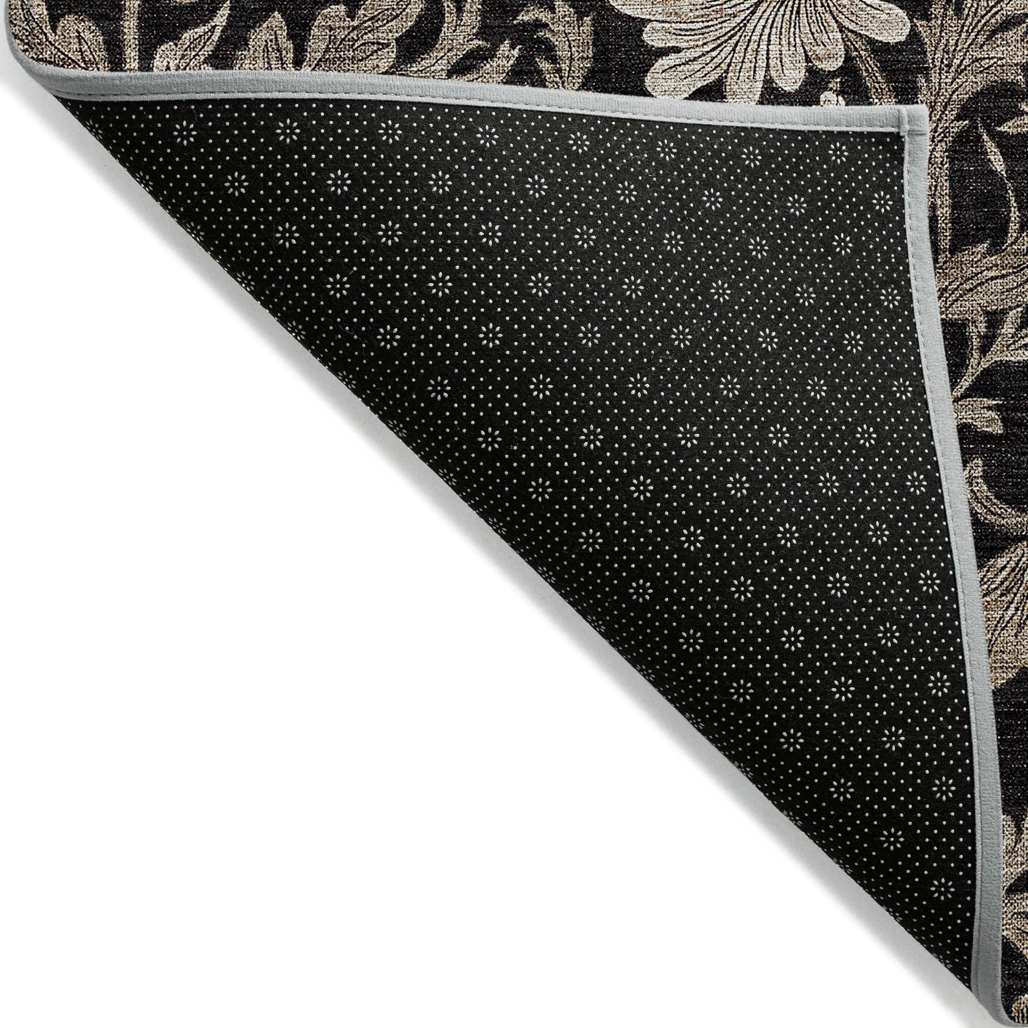 Chantille ACN677 Black area rug, a stunning addition to your decor. Featuring an intricate allover floral pattern with flowing leaf motifs, this rug embodies transitional floral design that effortlessly elevates any space. Not just a feast for the eyes, this rug is also practical - UV-stabilized for indoor or outdoor use and boasting an ultra-thin construction with a built-in non-skid backing to eliminate the need for a separate rug pad.