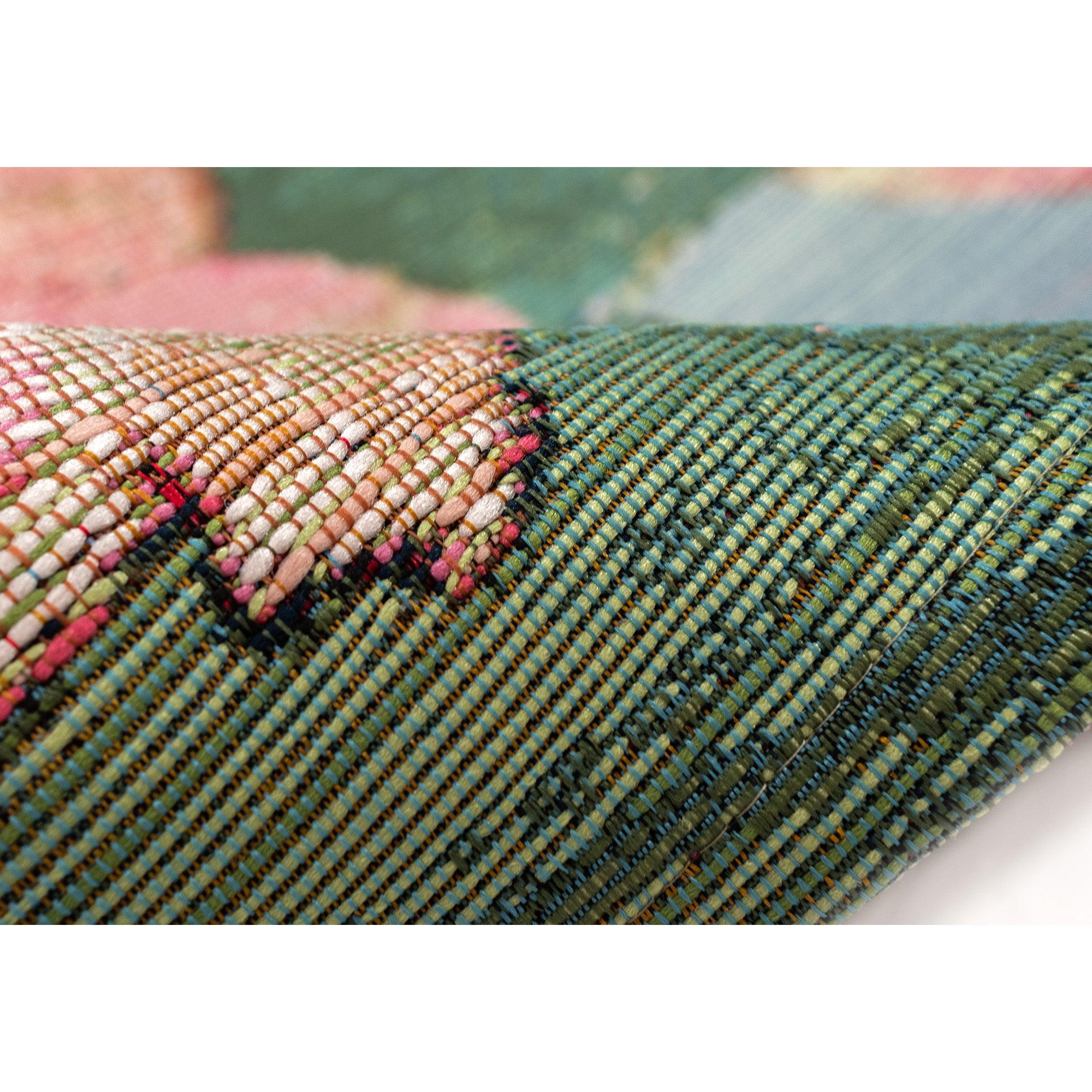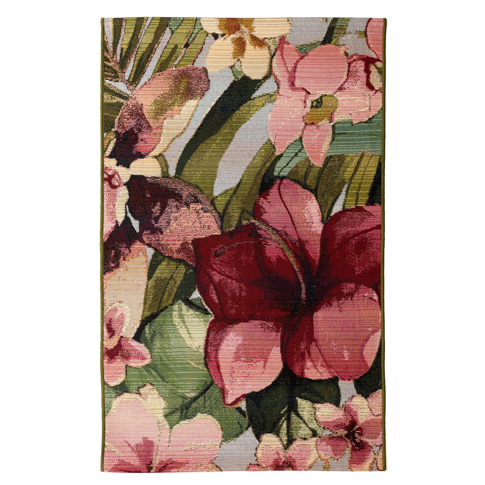 Transform any space into a tropical paradise with the Marina Tropical Floral Multi rug. Featuring oversized hibiscus flowers in vibrant pink and magenta hues, complemented by tropical palm leaves and ferns on a soothing blue backdrop, this rug is a visual delight. Crafted in Egypt from 100% polypropylene, the Marina Collection boasts intricate designs and a wide color range. Its flatwoven, low-profile construction is weather-resistant, UV-stabilized for fade resistance, and durable enough for high-traffic areas like patios, kitchens, and living rooms.