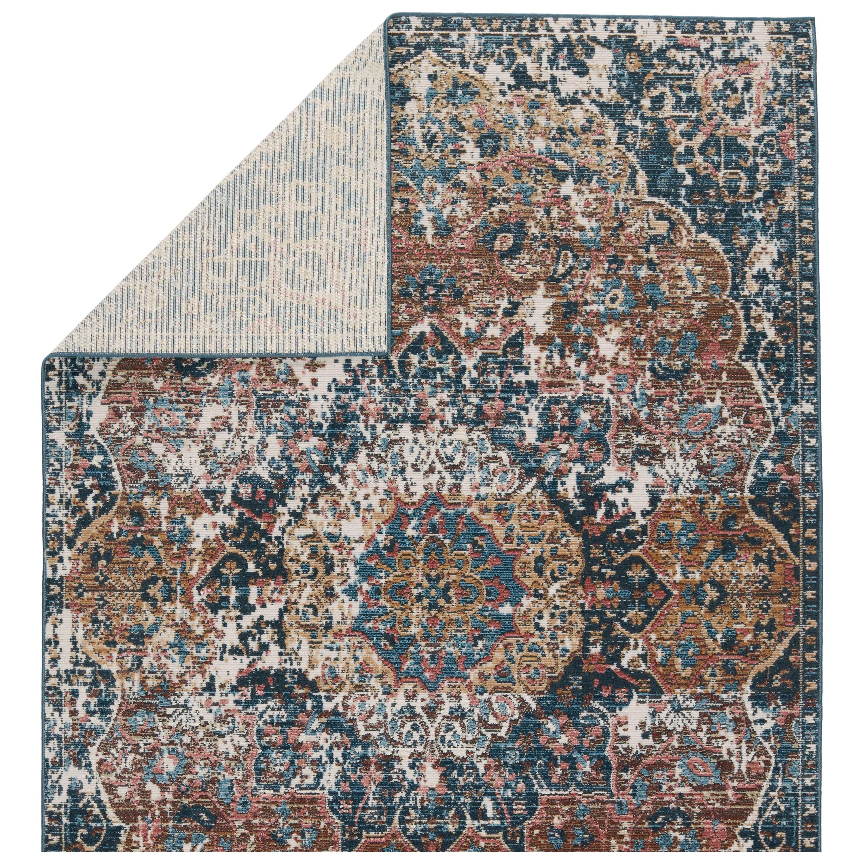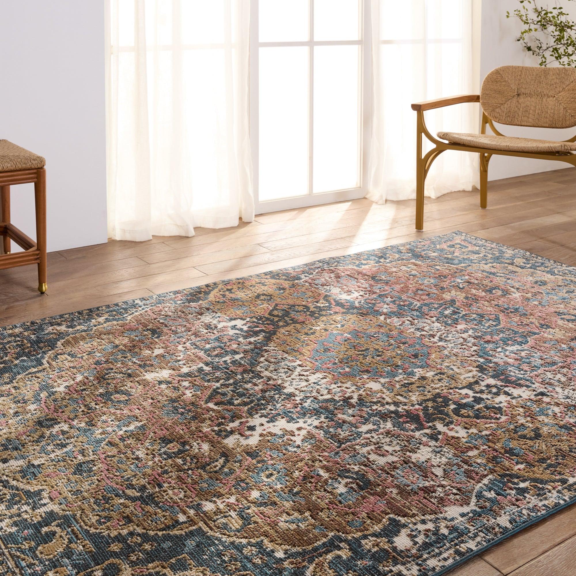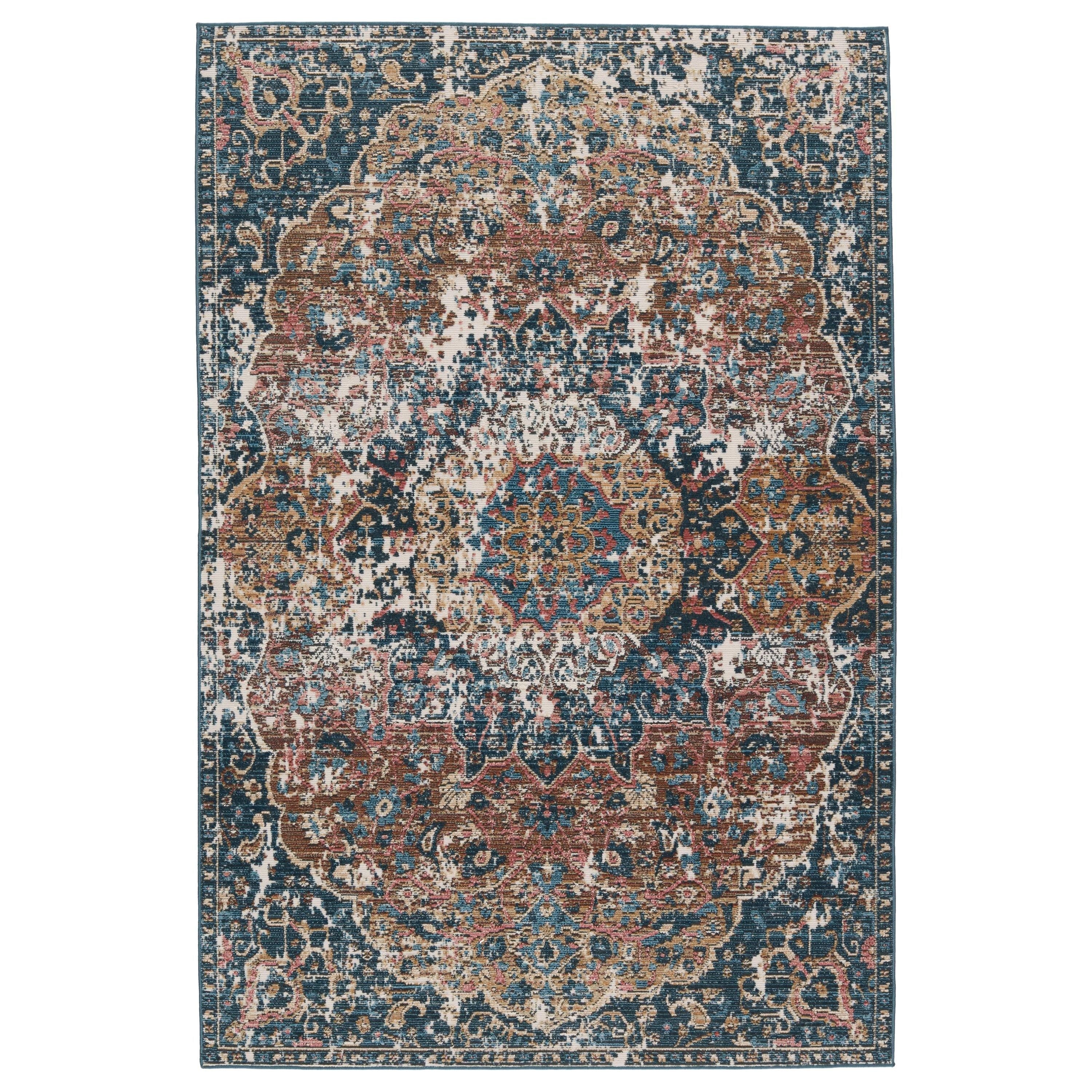 Swoon SWO15 Akela rug, a stunning addition to any space with its enchanting and captivating style. The Swoon collection showcases whimsical color combinations inspired by traditional Turkish textiles, creating a vibrant and timeless look. The Akela design is highlighted by a center medallion and rich hues of blue, golden brown, cream, charcoal, and rust for a romantic touch.