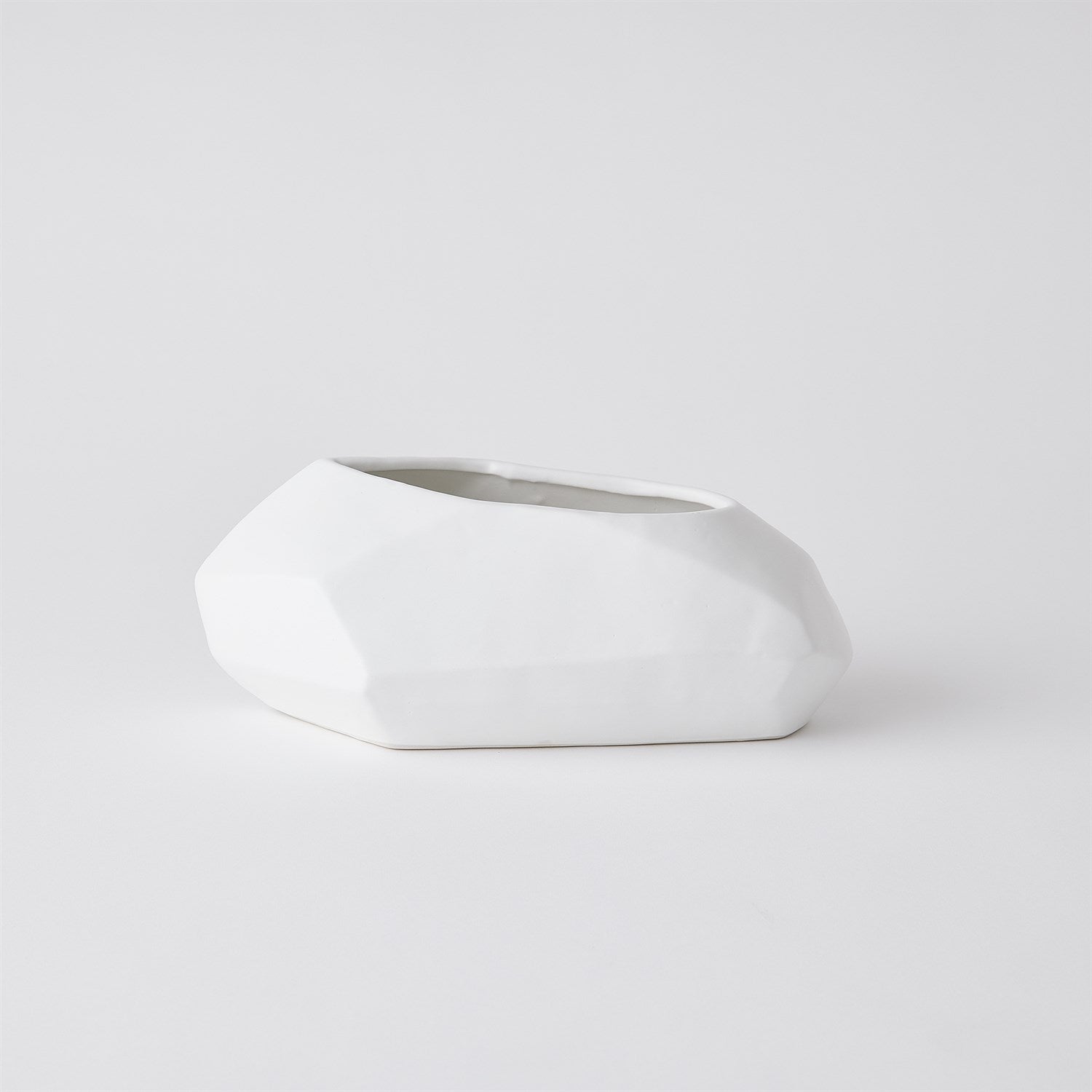 The Geometric Angled Bowl is crafted from ceramic, showcasing sharp, faceted lines and a matte white finish that brings sculptural interest to any modern living space.