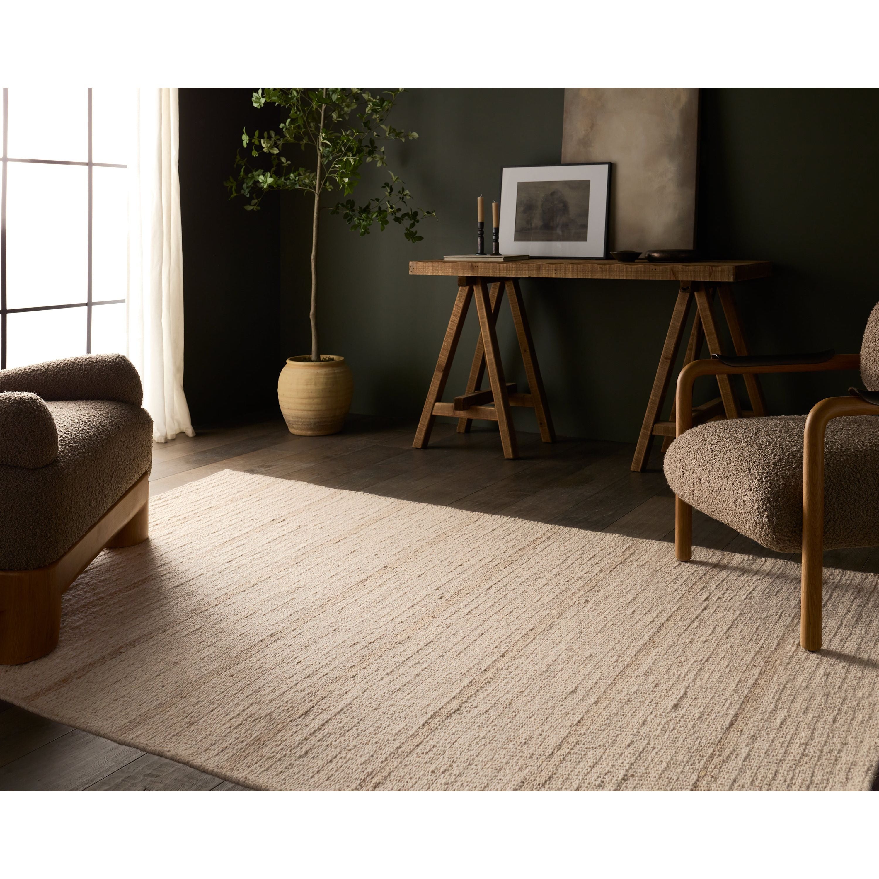 Made of 100% undyed wool, the Almeda rug unites horizontal stripes with a decidedly global point of view. Skillful weavers select from a wide range of undyed, hand-carded yarns, some light, others dark--serendipitously, peppering each beige and tan work of floor-art with unpredictable flecks of brown. Ideal for medium traffic, each rug is a unique work, perfect for today’s eco-chic interiors, naturally stain resistant and long wearing.