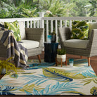 Catalina CAT52 Fraise rug, a stylish addition to any indoor or outdoor space. Perfect for patios or high-traffic living areas, this rug features a striking Fraise design with blue and green palm fronds against a bright white background, adding a touch of vibrant tropical flair.
