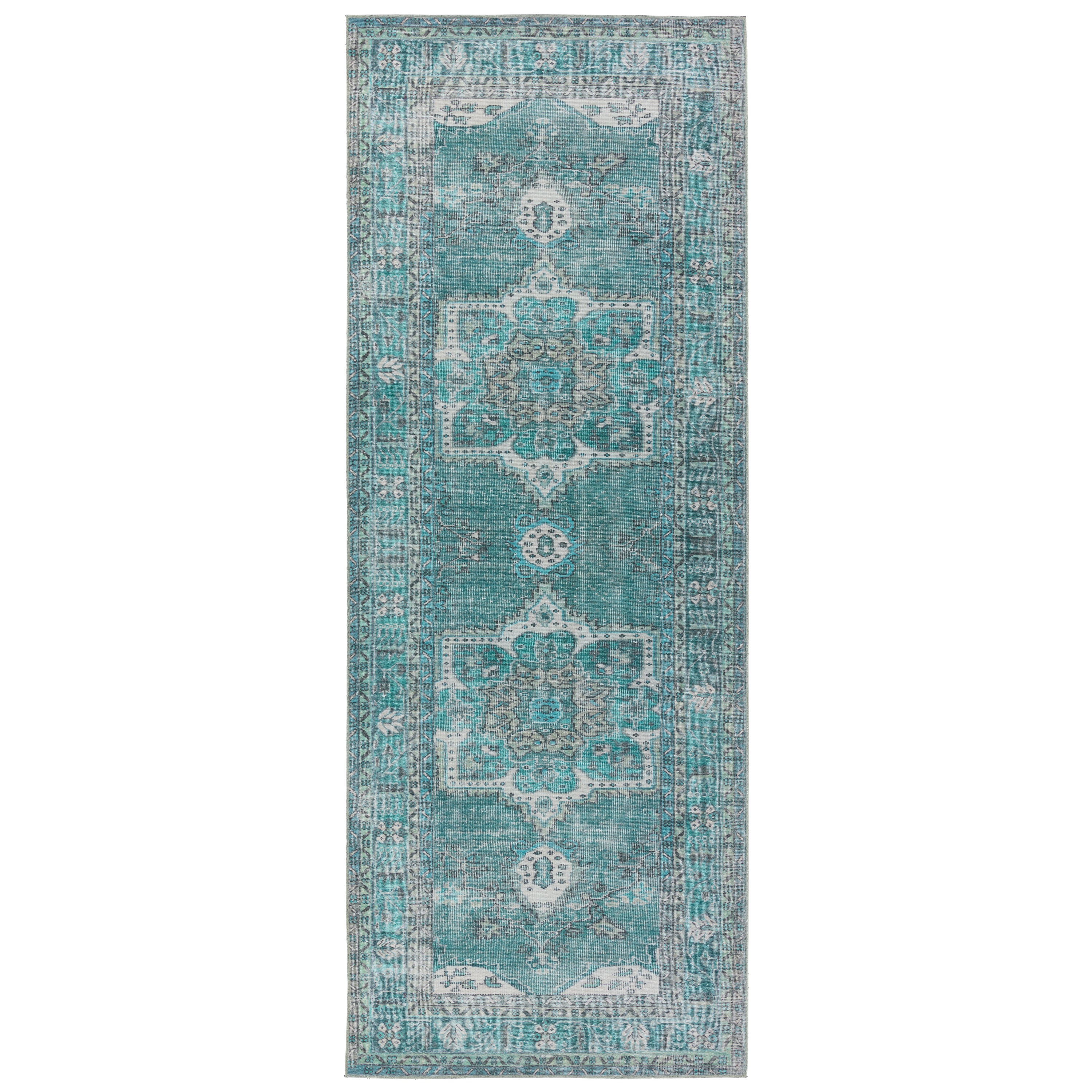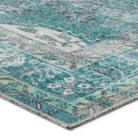 Harman Hold HHB02 Tamara, a stunning addition to Kate Lester's collaboration with Jaipur Living. Inspired by vintage designs from around the world, the Harman collection brings a touch of timeless elegance to any room. The Tamara area rug features a vibrant medallion pattern in shades of turquoise, cream, and pastel green, creating a striking focal point in your space. This digitally printed rug exudes charm with its perfectly distressed effect, adding character to your decor effortlessly.