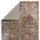 Harman Hold HHB03 Minita, a vintage-inspired area rug designed by Kate Lester in collaboration with Jaipur Living. The Harman collection features antique textile designs that bring a touch of heirloom-quality style to any room. The Minita rug showcases a faded medallion pattern in tones of brown, tan, and hints of blue, creating a timeless look that complements various decor styles.