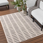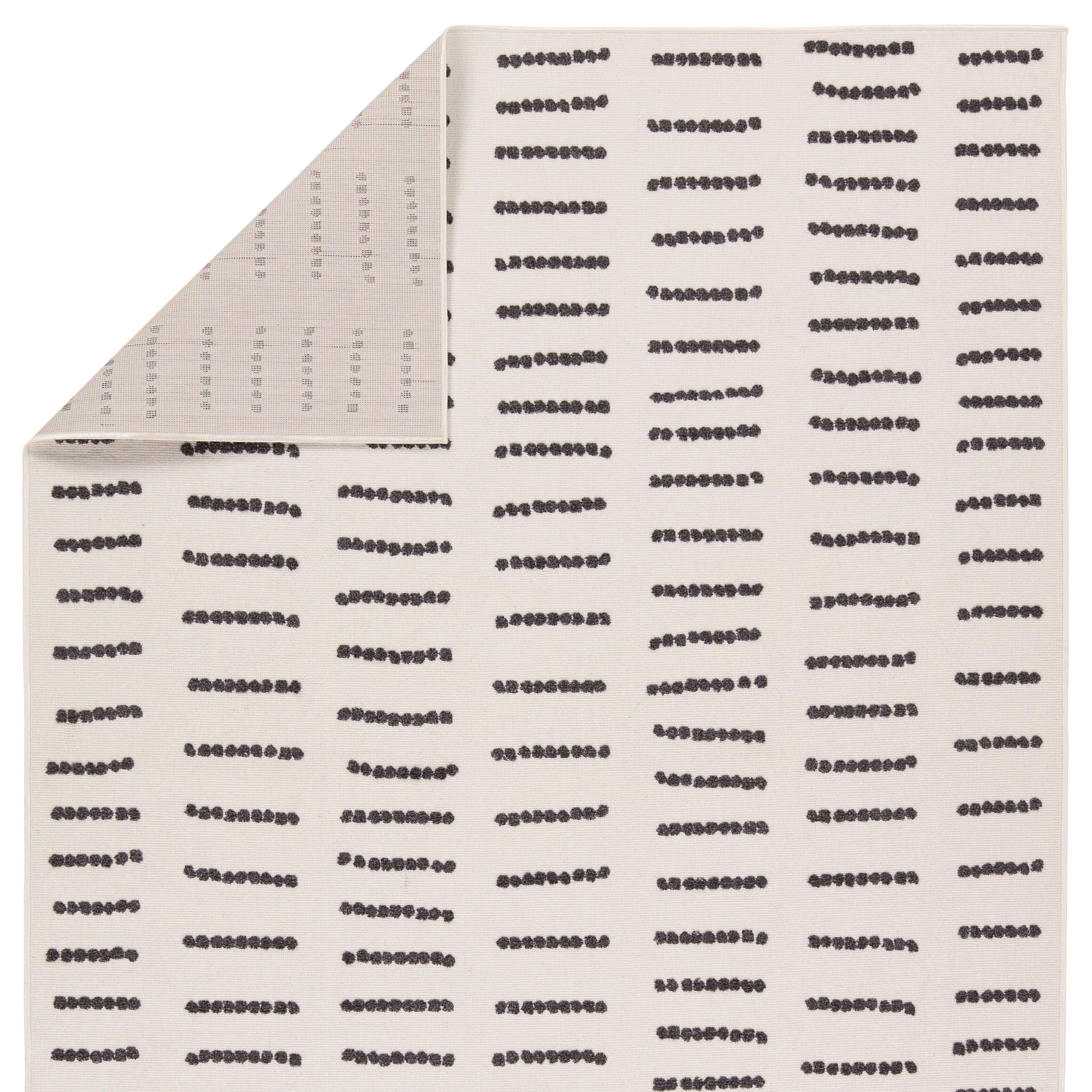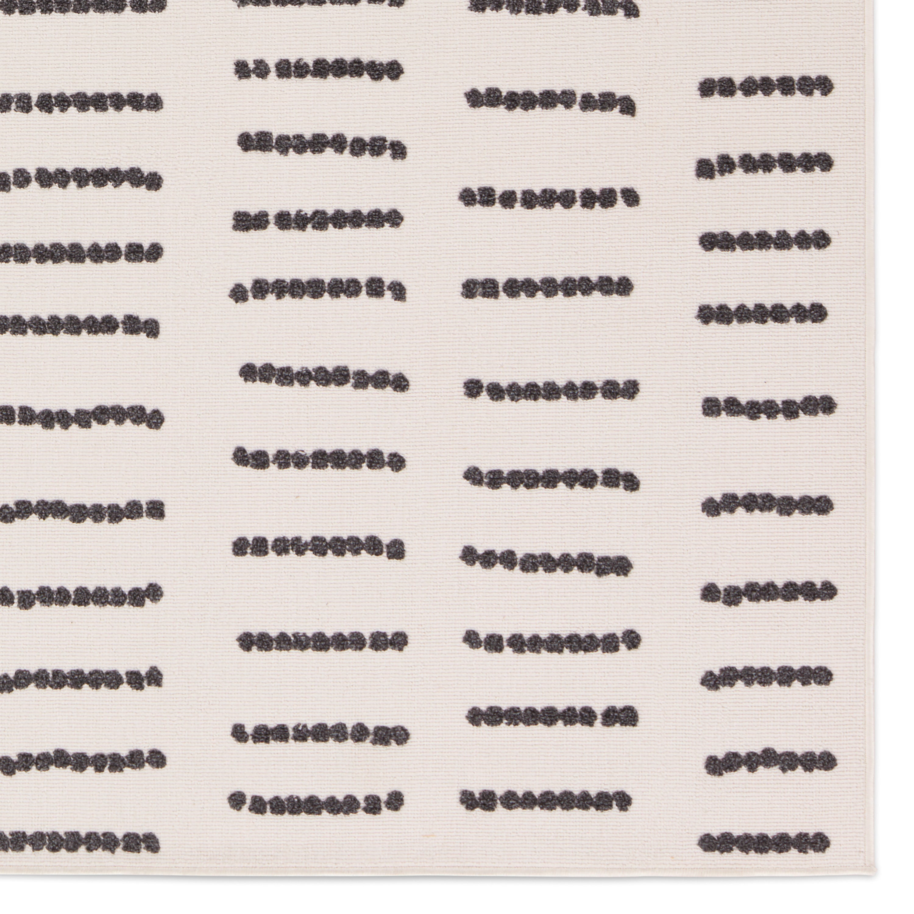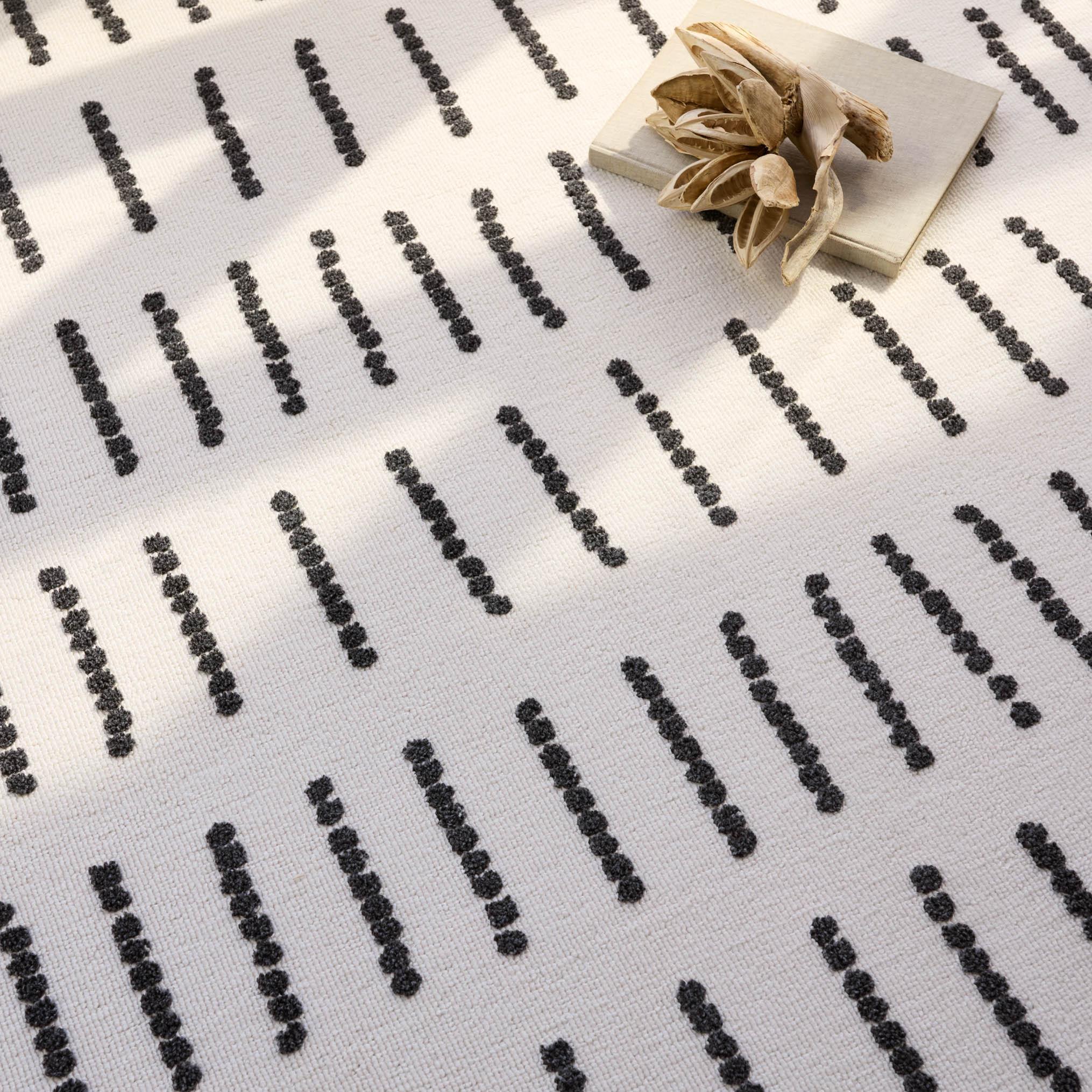 stylish Kysa KYS06 Javyn rug from the modern Kysa collection. This rug boasts a variety of simple geometric patterns in striking color combinations. The cream and charcoal Javyn design takes cues from traditional Turkish motifs, featuring linear and dotted details that pop against a plush pile. Crafted from 100% polyester, this rug is not only soft underfoot but also durable and easy to maintain, making it ideal for high-traffic areas both indoors and outdoors. Elevate your living space with this versatile and eye-catching rug that adds texture and dimension to any room.