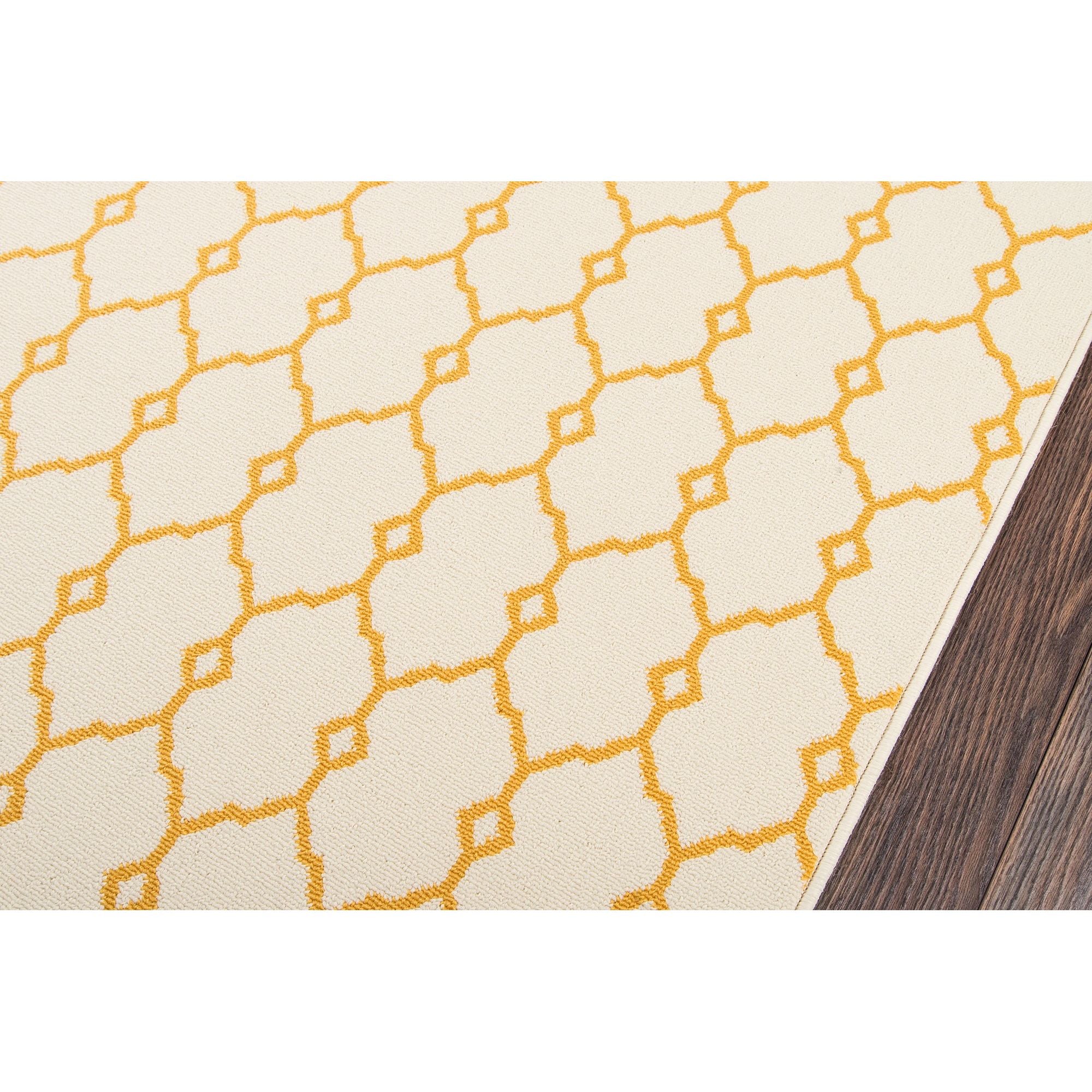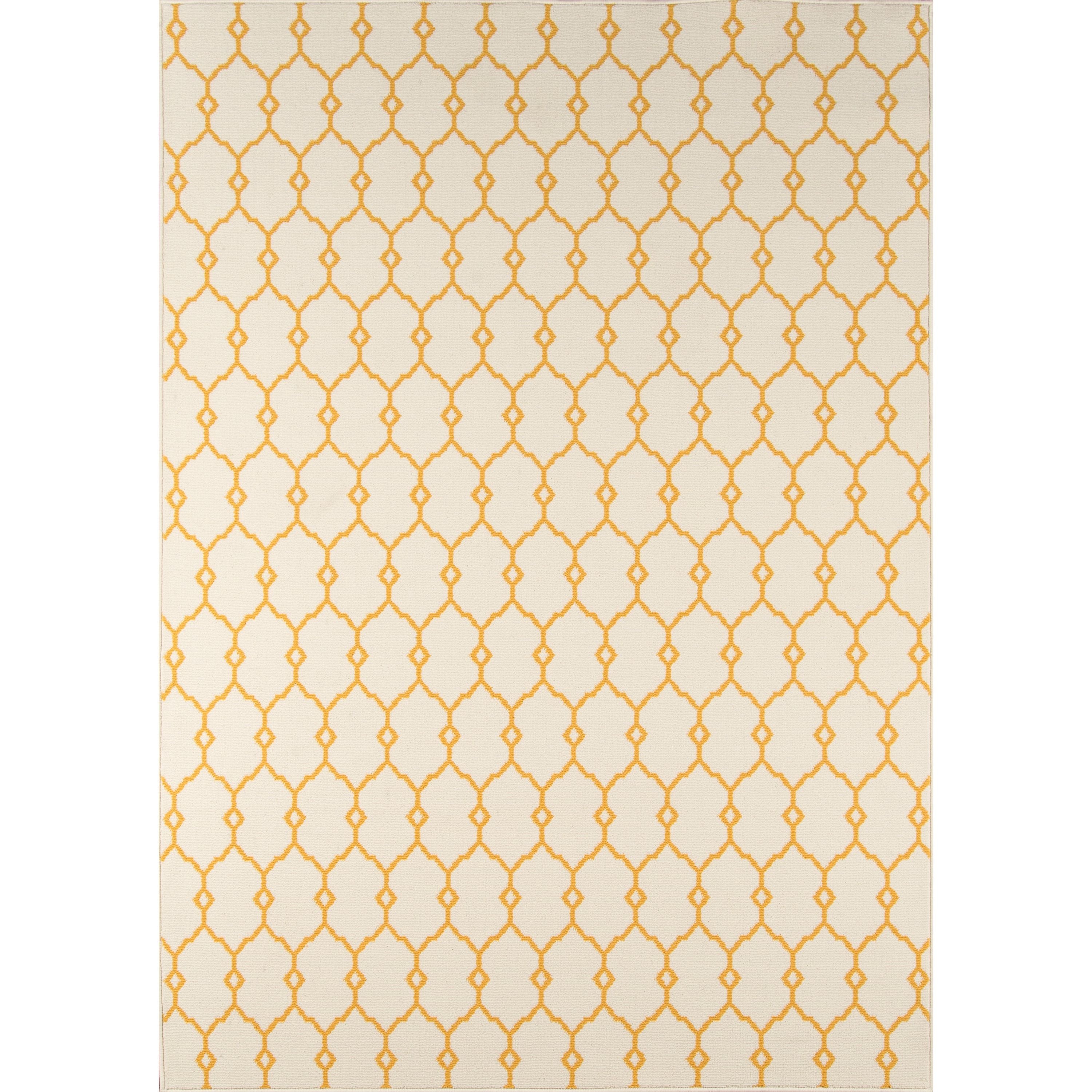 Baja Baj 2 Yellow, a versatile indoor/outdoor area rug designed to elevate any space with style and durability. This all-weather rug features a captivating mix of stripes, diamonds, trellis patterns, and nautical motifs like ropes and anchors, creating a sophisticated look for both interior and exterior settings. Perfect for patios, porches, and pool decks, the rug is power-loomed from resilient polypropylene fibers that can withstand changing seasons effortlessly.