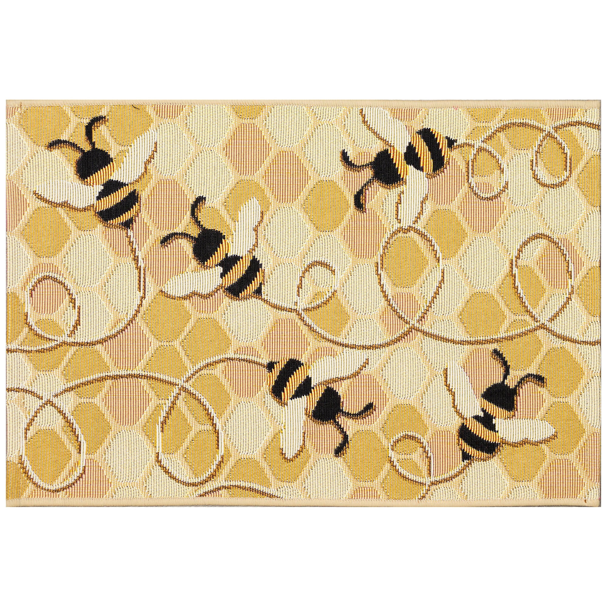 stunning Esencia Bee Free Gold garden mat, a delightful addition to any outdoor space. This nature-inspired mat showcases charming black and yellow bees frolicking on a beautiful gold mosaic backdrop. Perfect for adding a touch of whimsy and elegance to your garden or patio, this transitional novelty piece is sure to capture attention.