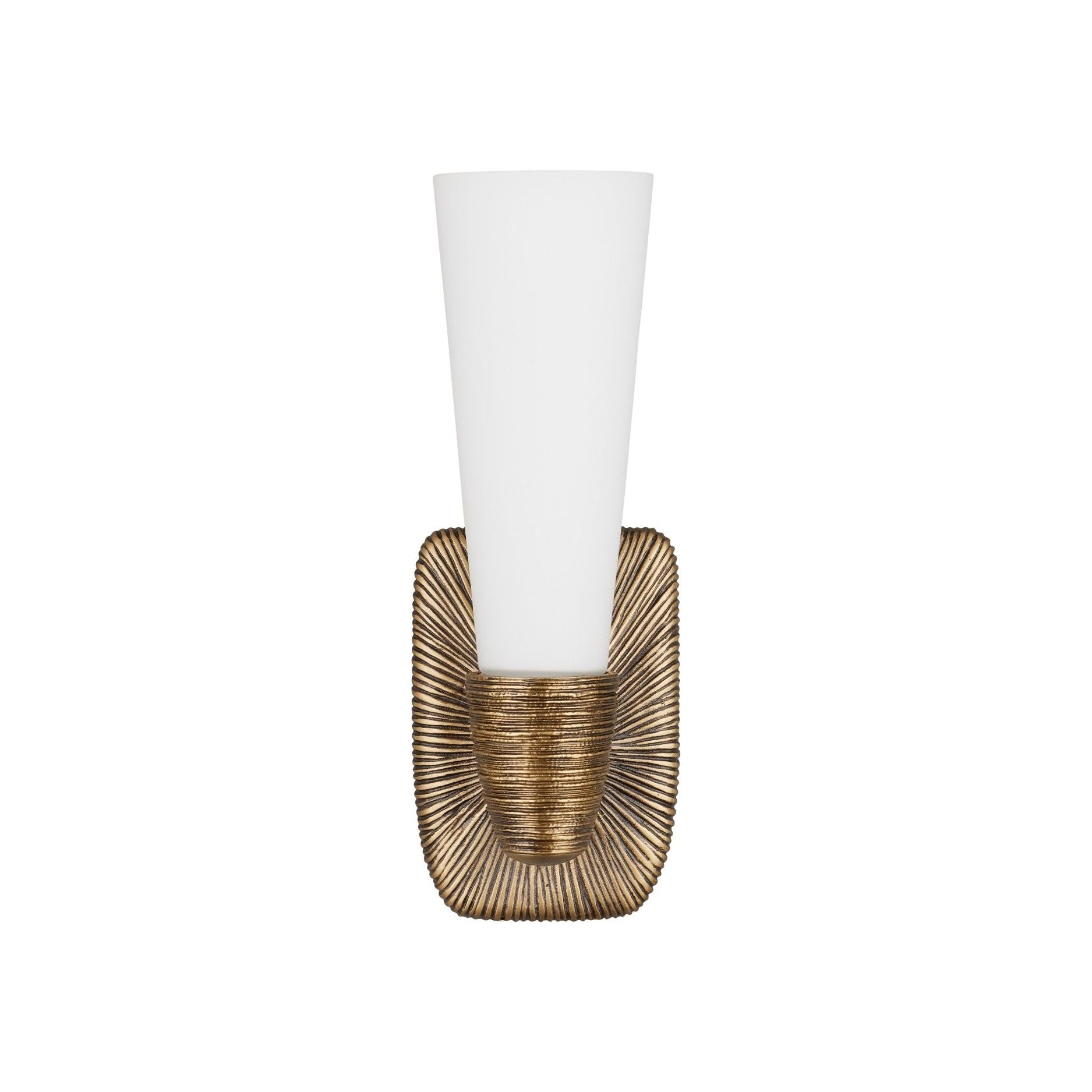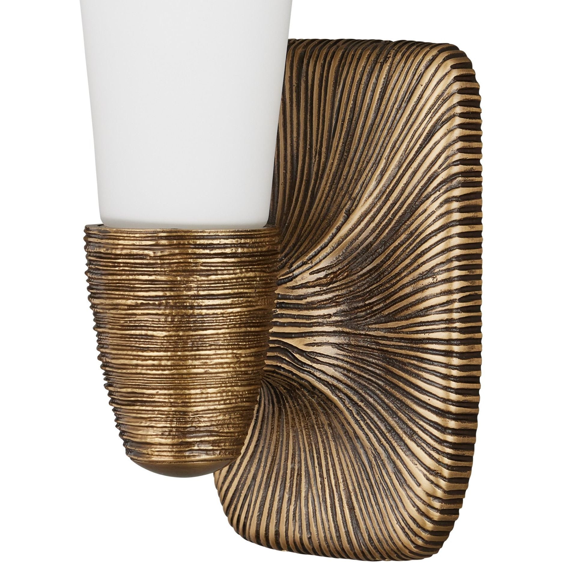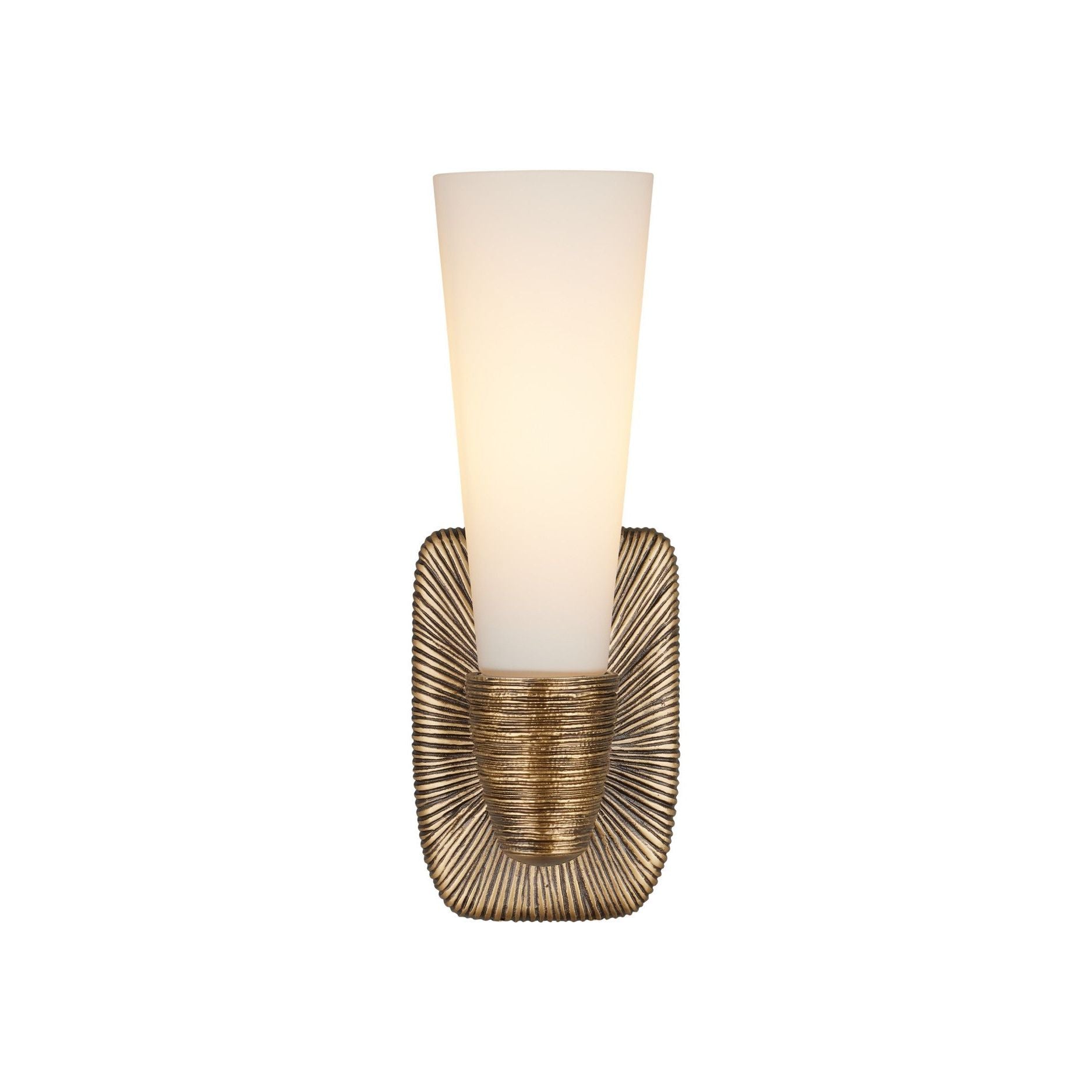 The Bonaz Bath Wall Sconce blends sculptural texture with refined contrast for a standout bathroom accent. Made of cast brass, the fixture features dramatic surface detailing that resembles flowing strands of hair pulled into a tight bun. A single white glass shade rises from the top of the antique brass wallplate, creating a soft, ambient glow. At 14 inches tall, this one-light sconce is both dimmable and damp rated.