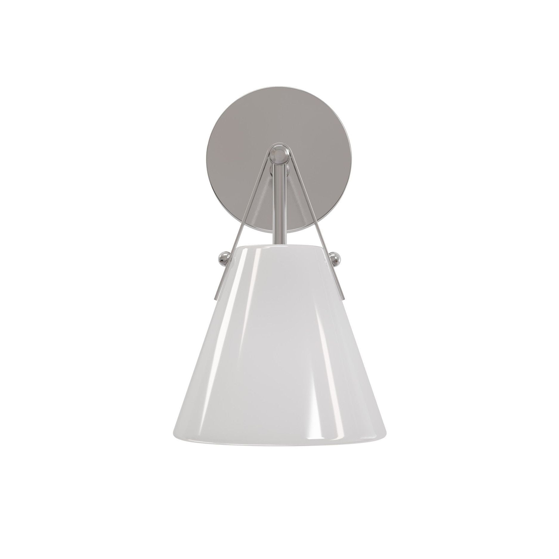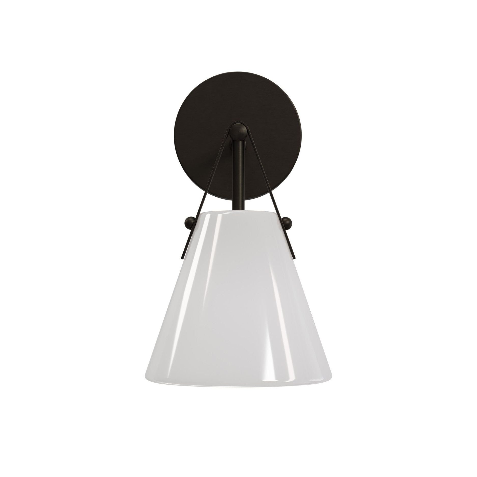 The Bronwen Bath Wall Sconce brings equestrian-inspired elegance to bathroom lighting. A flared white glass shade, with a glossy surface that softly glows, is secured to a round wallplate by a refined metal strap—a subtle nod to classic tack hardware. The antique brass finish on the metal creates a warm contrast against the pale glass. The Bronwen leans modern farmhouse but complements a wide range of styles. The one-light sconce is dimmable.