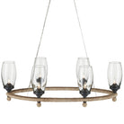 The perfect combination of natural and industrial materials, the Hightider Glass Oval Chandelier has recycled glass shades and wrought iron hardware in a French black finish. The abaca rope that is wrapped around the ring of the nautical pendant brings it a hint of texture. Clarence Mallari's original inspiration came from the small bells used by people selling ice cream in the Philippines. The aircraft cable on which the rope chandelier suspends keeps the design light.