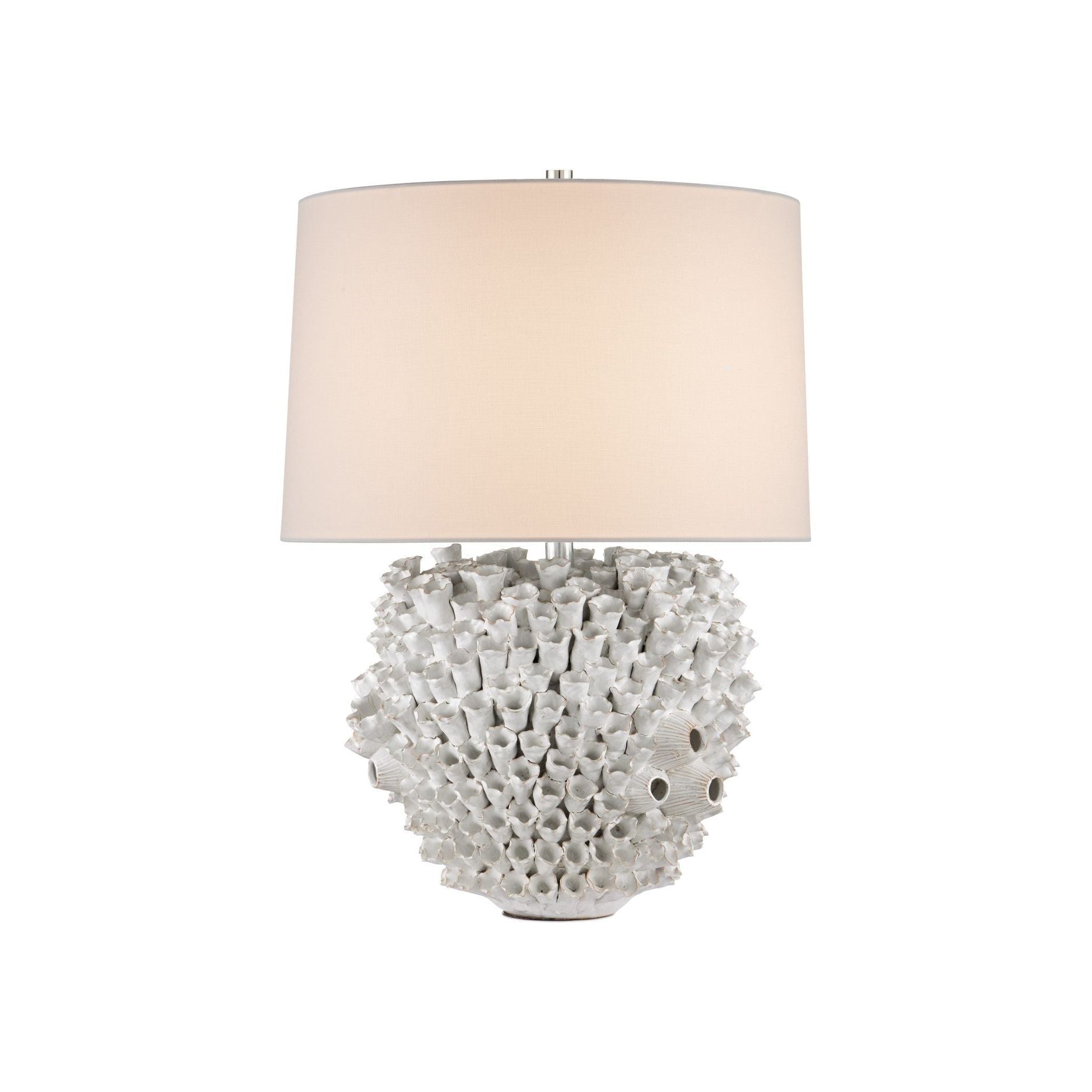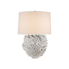 The Manitapi Table Lamp is a handcrafted ceramic piece made from dark clay that has been thrown, carved, decorated, and glazed entirely by hand. Sculpted sea-inspired elements—primarily coral-shaped forms with occasional clusters of barnacles—are individually crafted from clay and applied to the body. Finished in white, the lamp is a unique expression of artistry and craftsmanship.