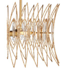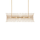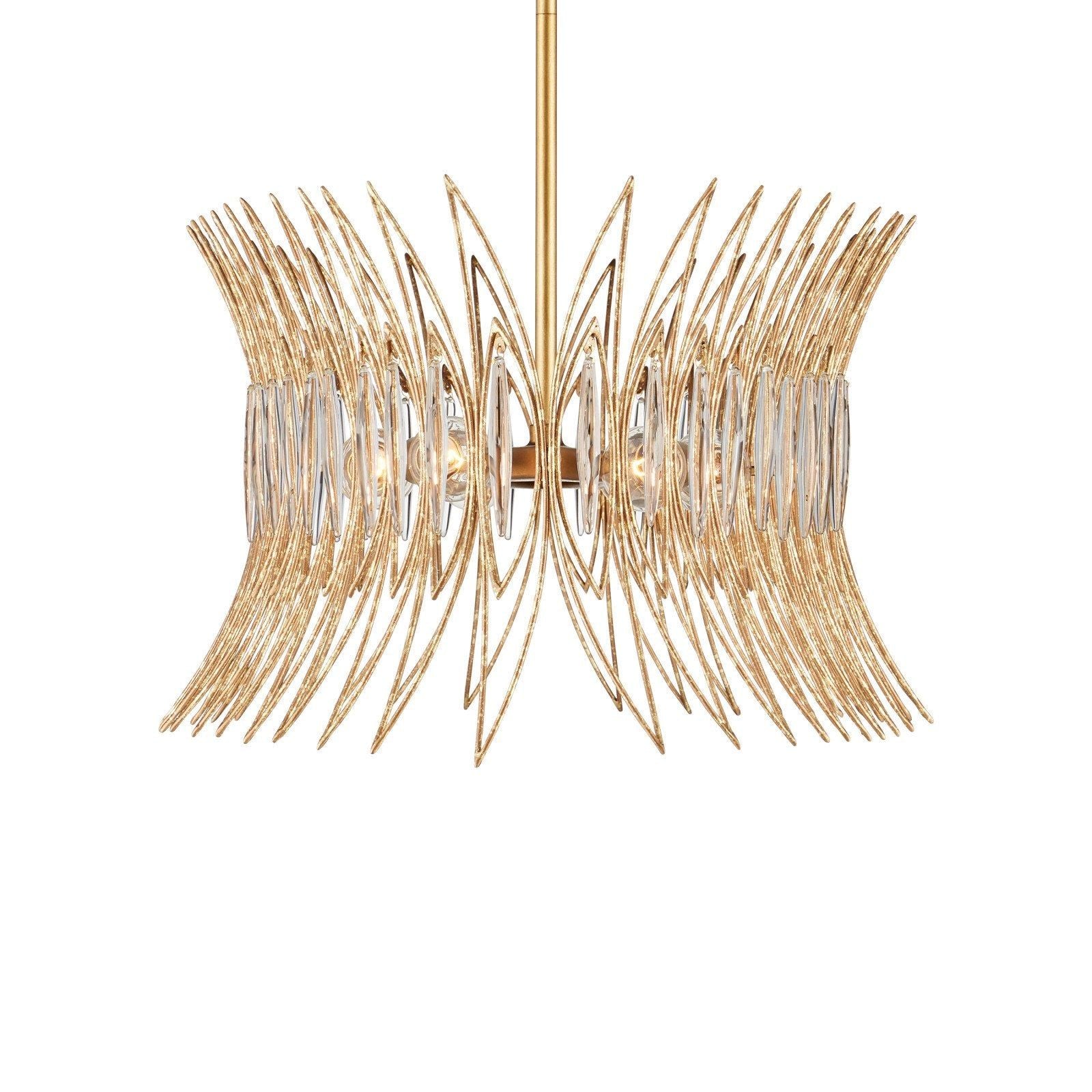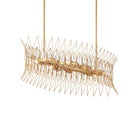 The Marquise Oval Gold Chandelier is crafted from slender wrought iron wires in a Luxor gold finish, giving the surface a subtly speckled texture. Inspired by mid-century jewelry design, the crown-like frame holds abstract leaf motifs, each of which is adorned with an oblong piece of clear glass that catches and diffuses the light from the eight bulbs within. At 40 inches in diameter, this chandelier is dimmable. Adjustable from 19.75" to 61.75" with use of included chain/rod kit/cable. If your space calls for a longer drop, additional chain/rods/cable is available for purchase.