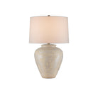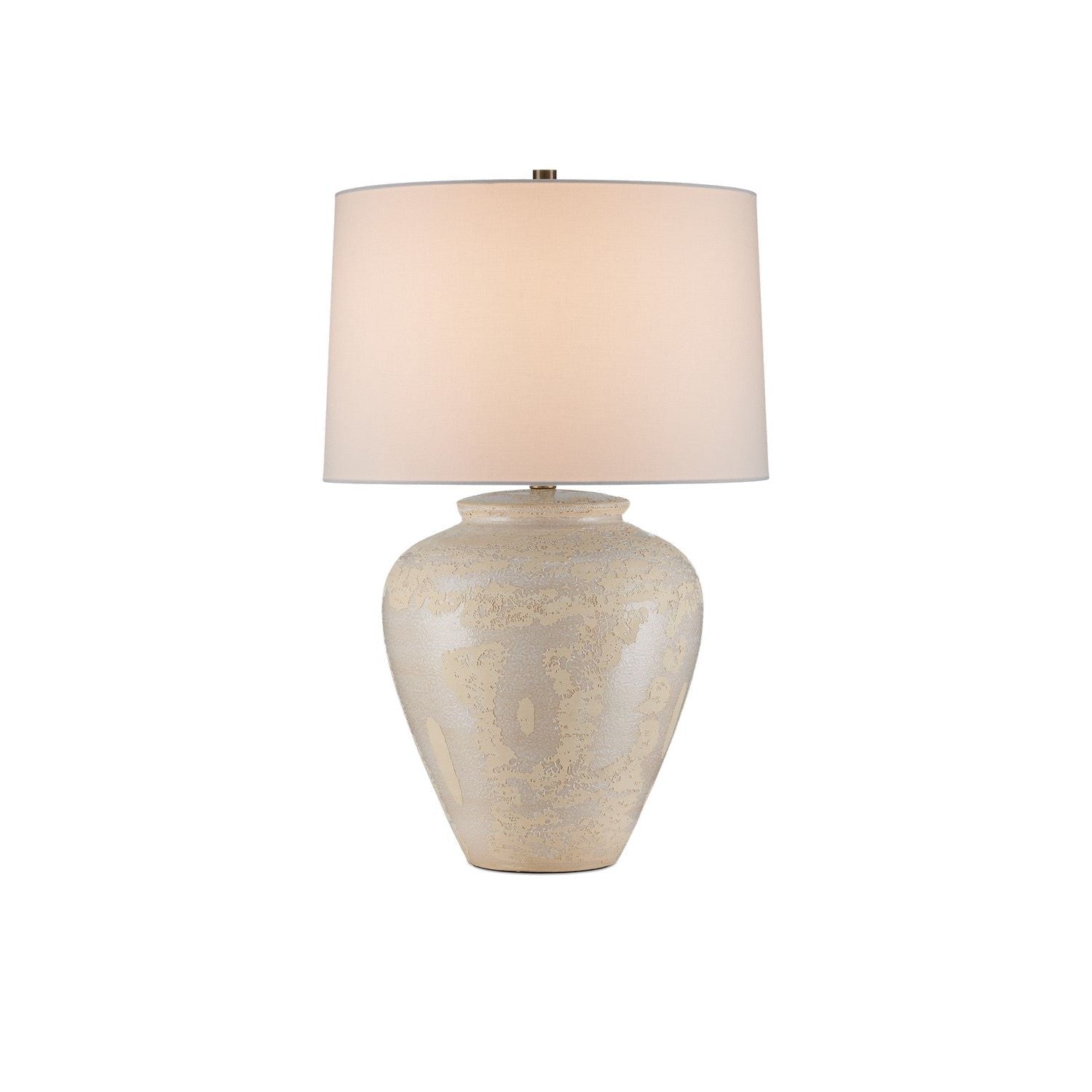 The Mimi Ivory Table Lamp is made of ceramic with a mix of ivory and cream glazing, which creates a swirling pattern to give its surface tone-on-tone depth. The ginger-jar shape of the cream-colored lamp is topped with an drum shade that echoes the pale hues in its body. The artisanal quality comes into full view when the surface of the lamp is viewed close up.