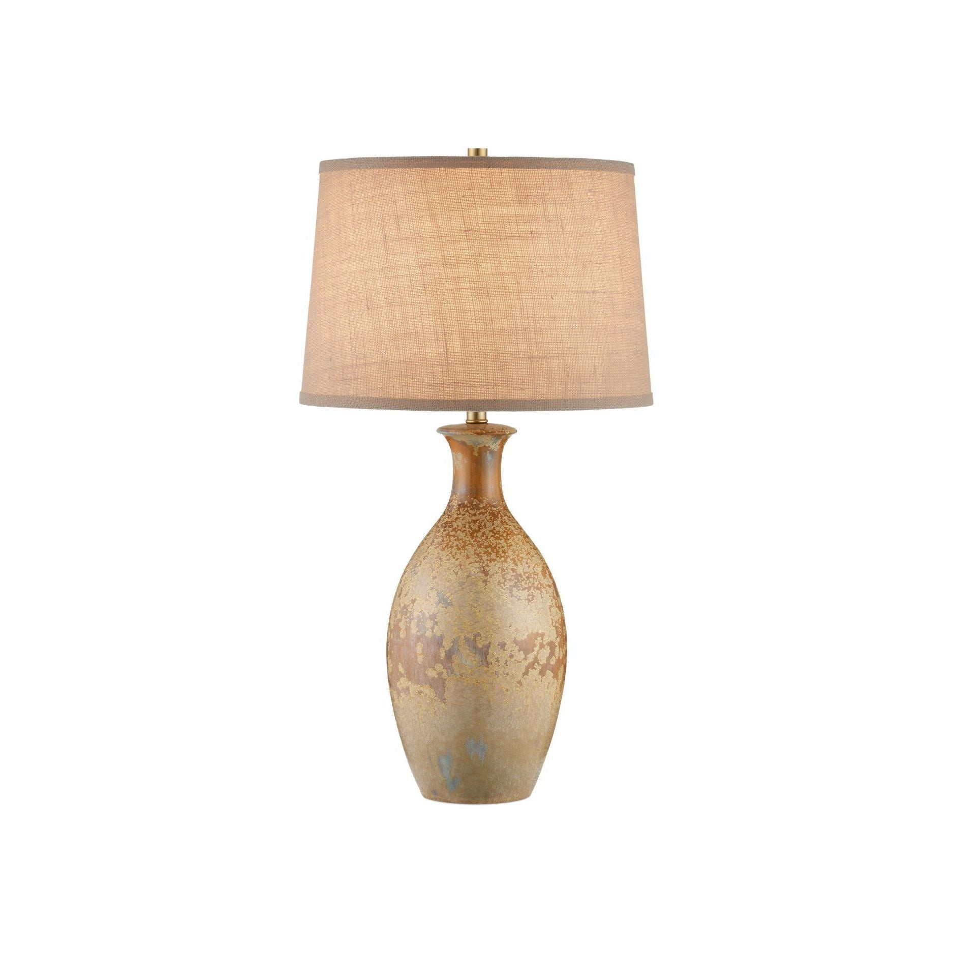 The Stellata Table Lamp features a richly speckled surface created through a process called crystallization during which multiple layers of differently colored glaze react as the lamp is fired to form tiny surface crystals. As minerals in the glaze respond to the kiln's high heat, they create delicate patterns that add subtle texture and a gentle sparkle. The result is a finish with depth, variation, and visual interest—no two lamps are exactly alike.