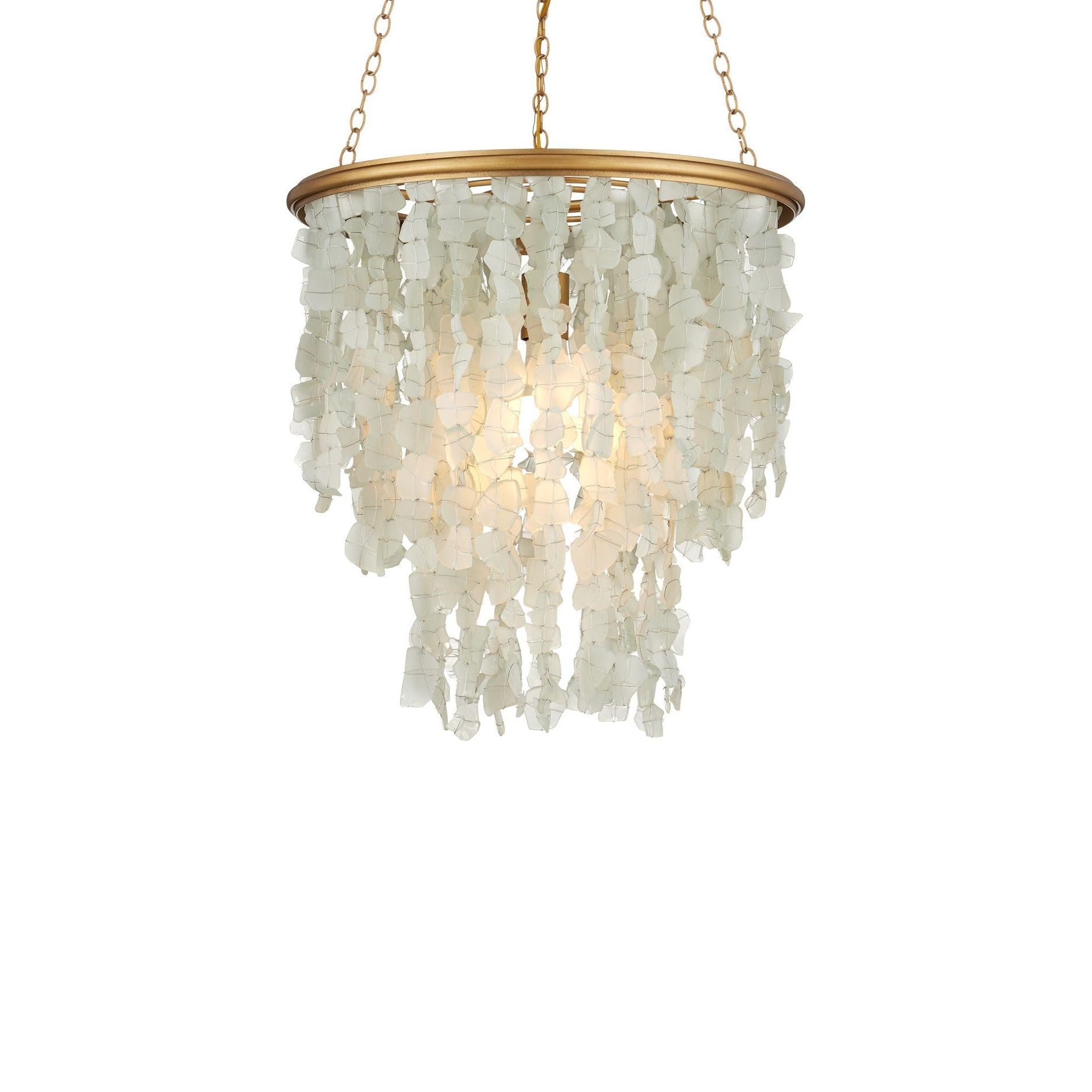 The Verre de Mer Chandelier features a cascading shade made from sand-blasted glass, hand-cut from recycled bottles to evoke the look and texture of seaglass. Each piece is individually attached to the round metal frame, which is finished in a contemporary gold for a warm contrast. The four layers of glass catch and diffuse the light from a single bulb, creating a soft, ocean-inspired glow. Adjustable from 32" to 95.5" with use of included chain/rod kit/cable. If your space calls for a longer drop, additional chain/rods/cable is available for purchase.