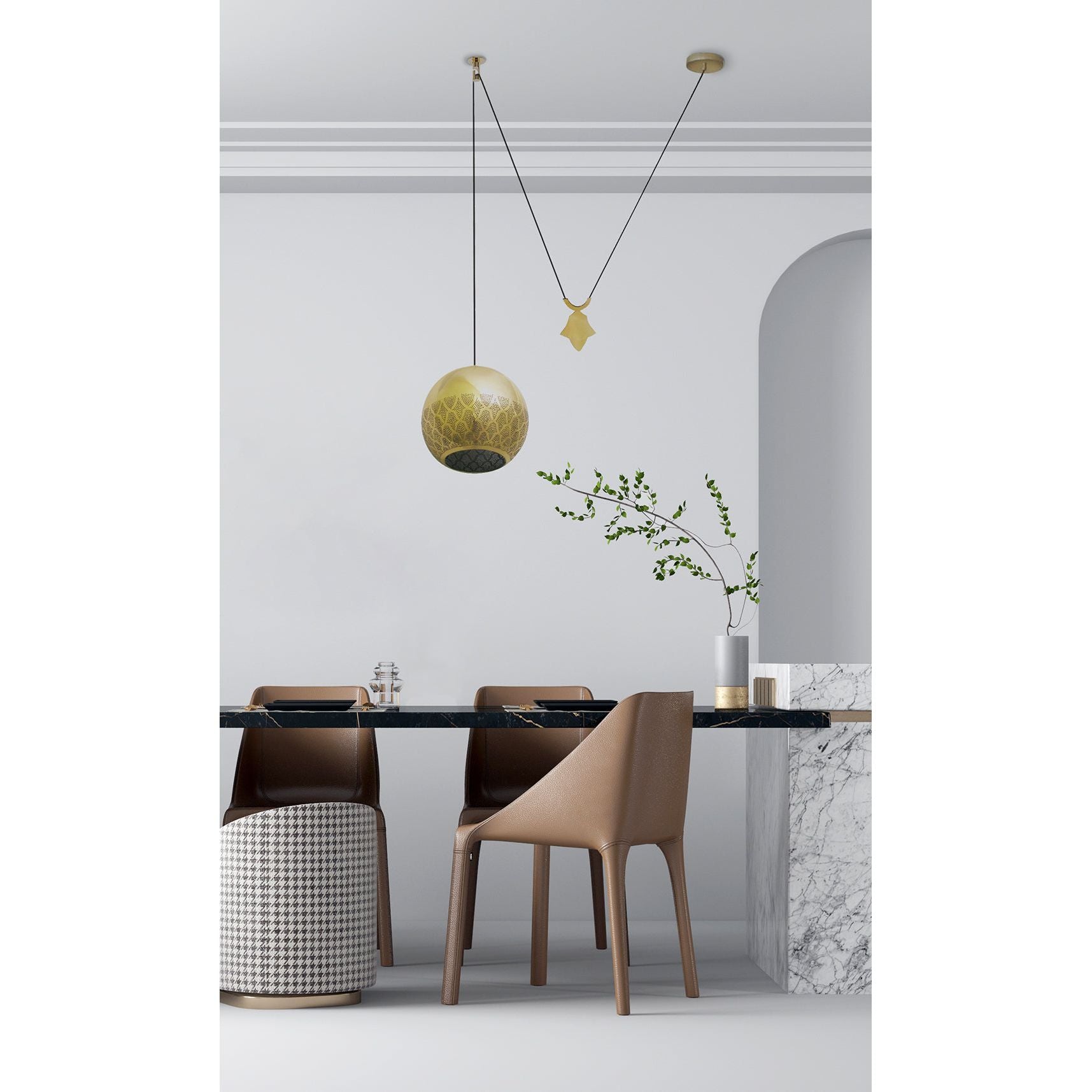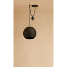 Award-winning, Nur Reversed counterweight Pendant Light is luxurious Moroccan lighting at its best! It won best in market at the NY NOW show in New York City. The design of this fixture is our take on oriental and Moorish lamps. The intricate hand-pierced pattern casts exquisite shadows onto the space and provides a focused light. The sphere shape provides the perfect canvas for the Darj W Ktef design. The counterbalance weight comes in the finish of your fixture. Choose between a solid sphere or a hamsa design to elevate your suspended fixture. The pendant is hung using a black cloth cord and a swag hook in the matching metal finish. The Hamsa counterweight is 4"x6". It's made from solid brass, copper, or nickel silver.