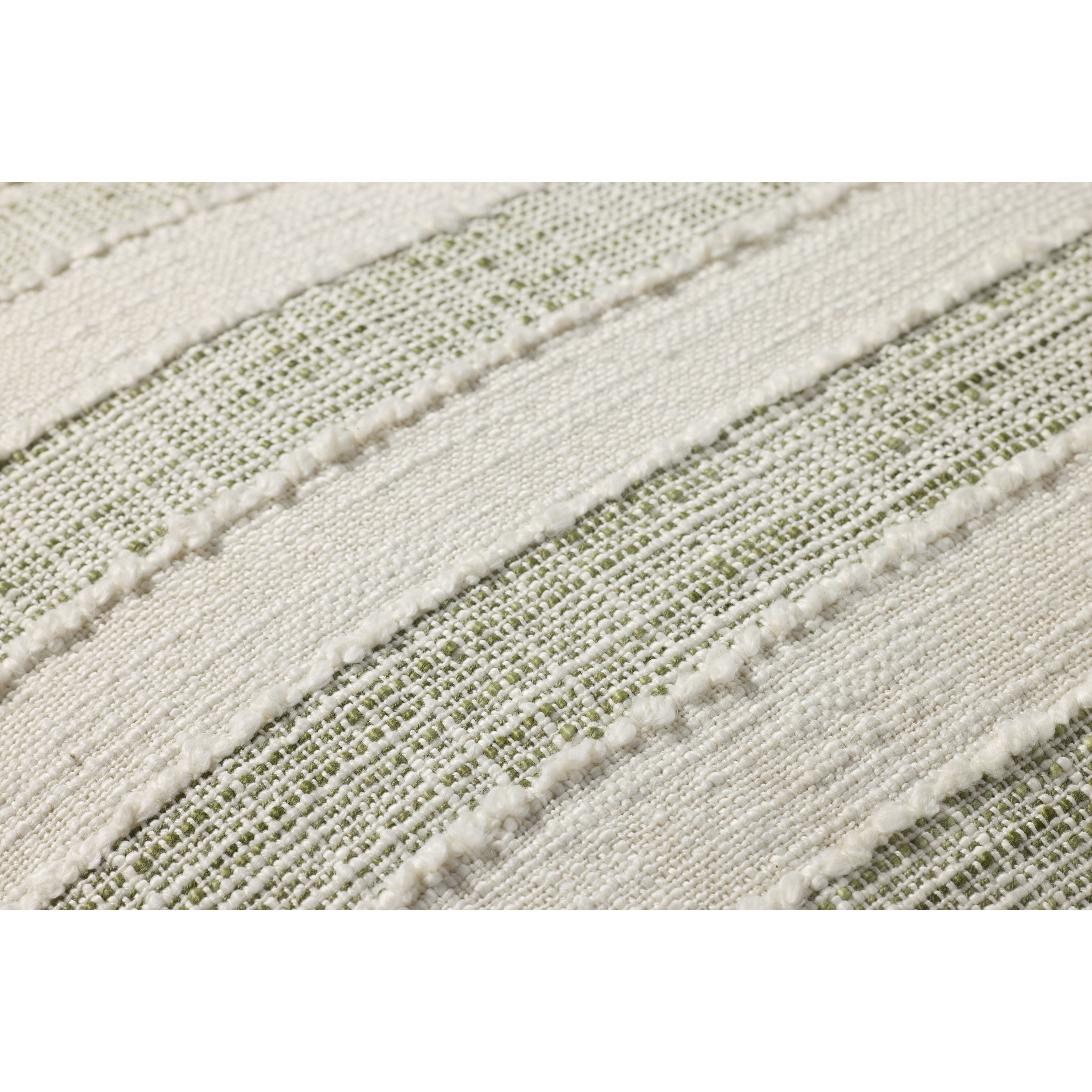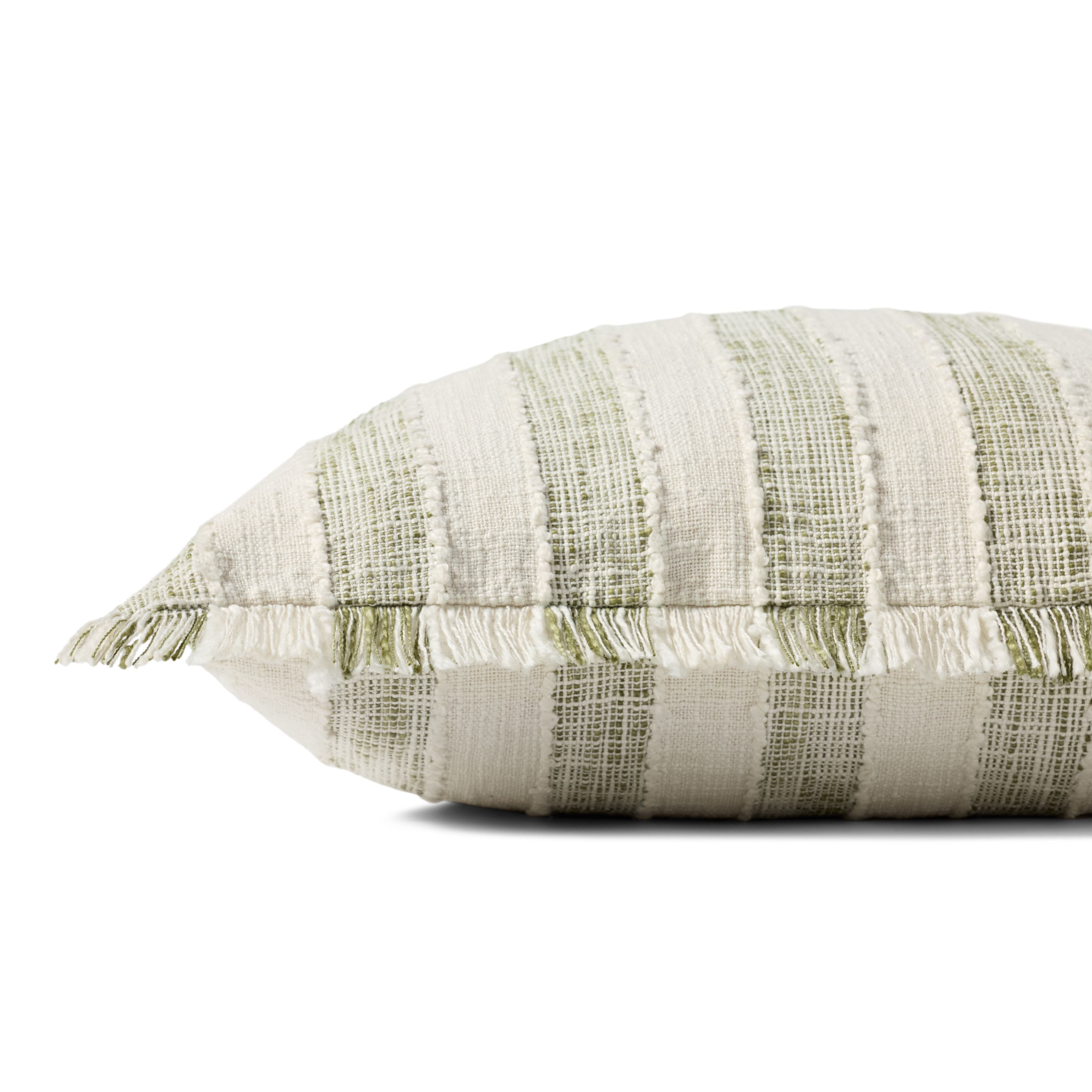 This woven throw pillow features green and ivory stripes with fringed edges and raised stitch detailing. The pillow cover is made of cotton and polyester and measures 22” x 22”, a standard size to style in living rooms and bedrooms.