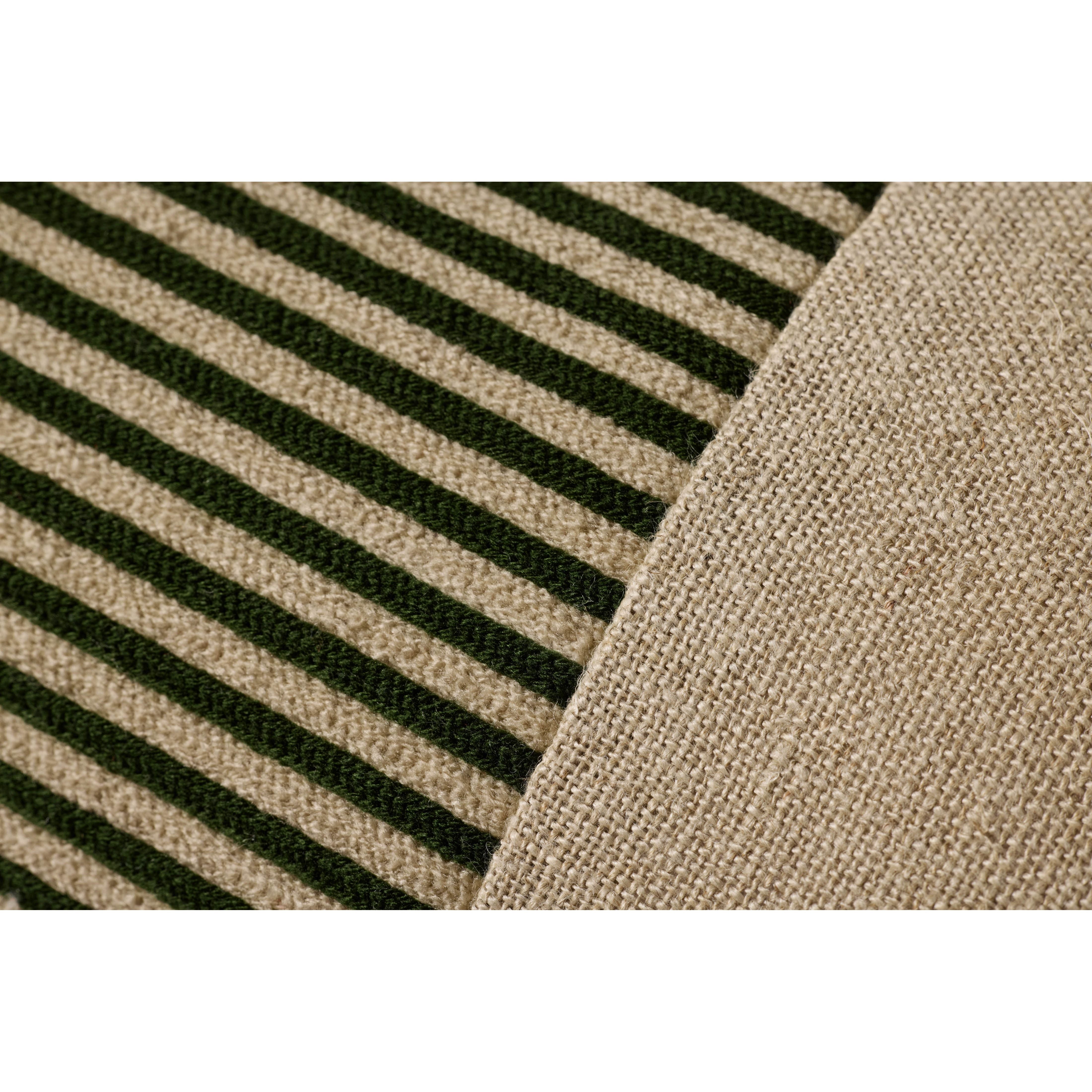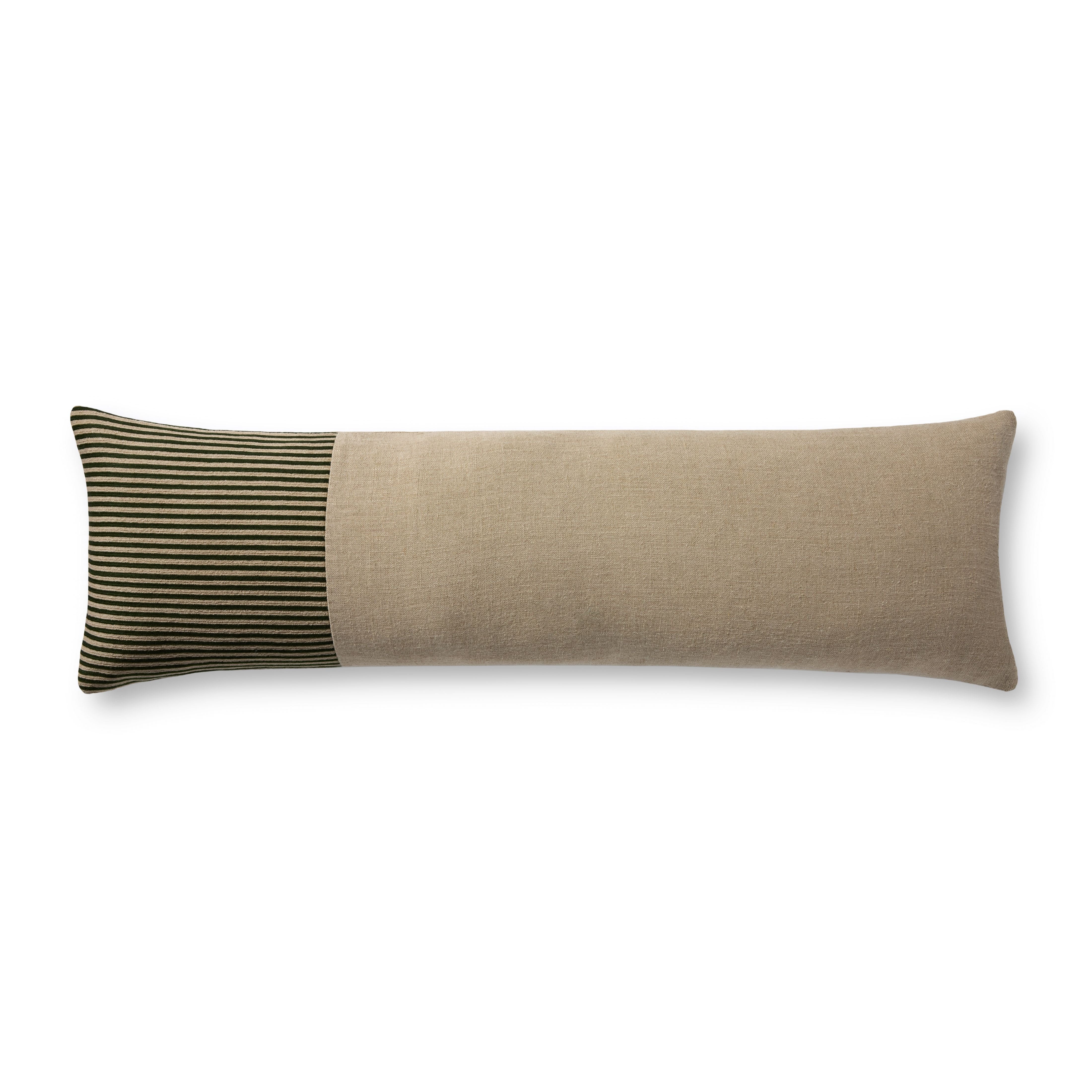 This extra-long throw pillow has an embroidered striped panel and neutral linen design for traditional, organic, or coastal home decor, among many classic styles. The 12” x 46” long decorative pillow can be an elegant accent across a bed, bench, or couch. The pillow cover is made in India of linen, with cotton, polyester, and acrylic embroidery.