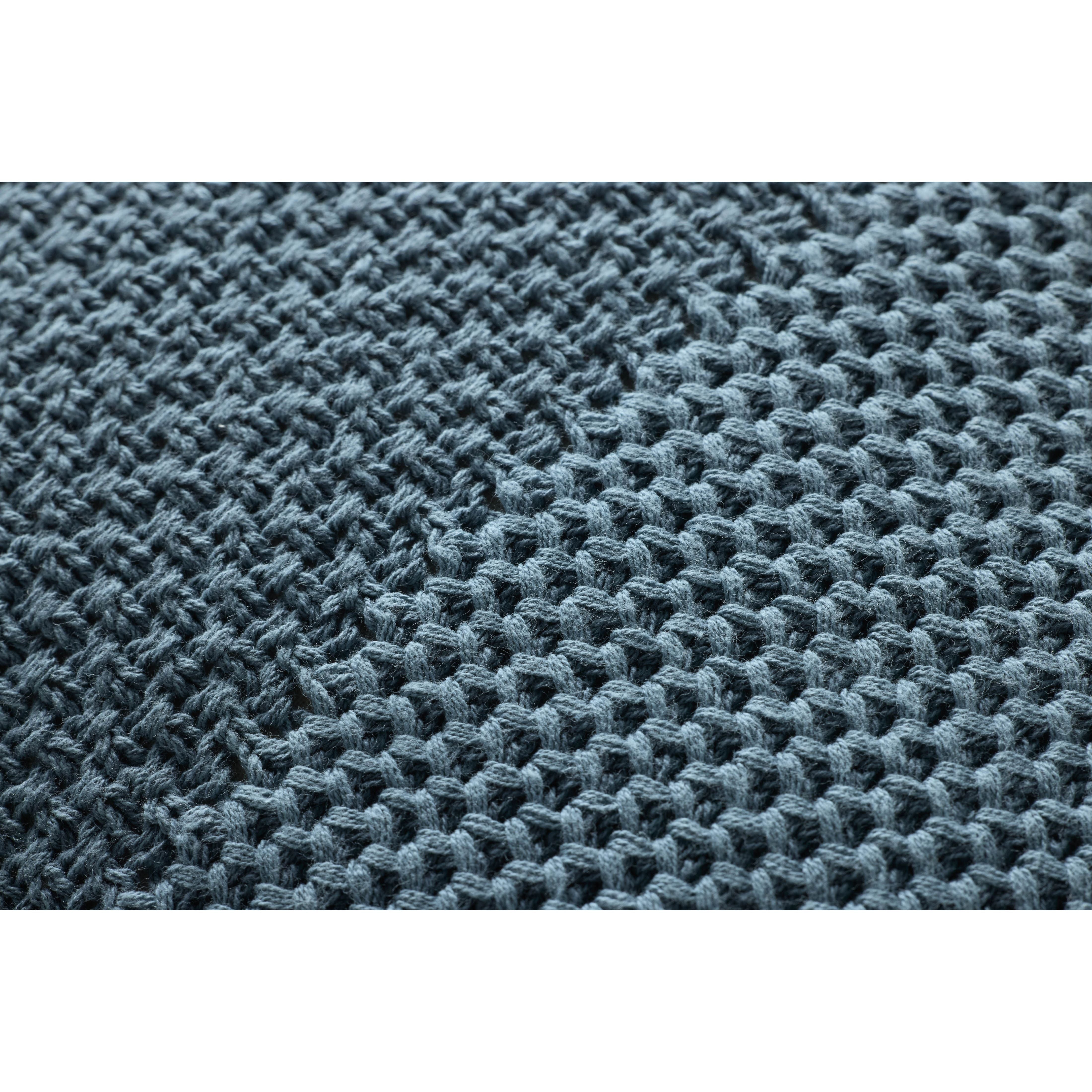 This dusky blue throw pillow has a soft woven texture and a darker-toned center stripe, a classic design for nearly all home decor styles. The 22” x 22” square pillow is machine-woven in India of 100% cotton.