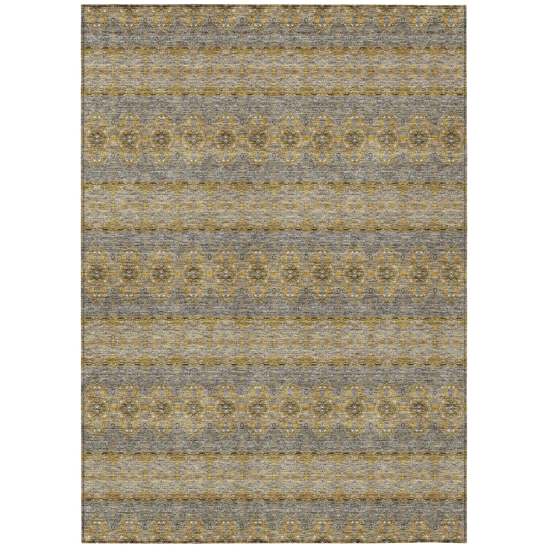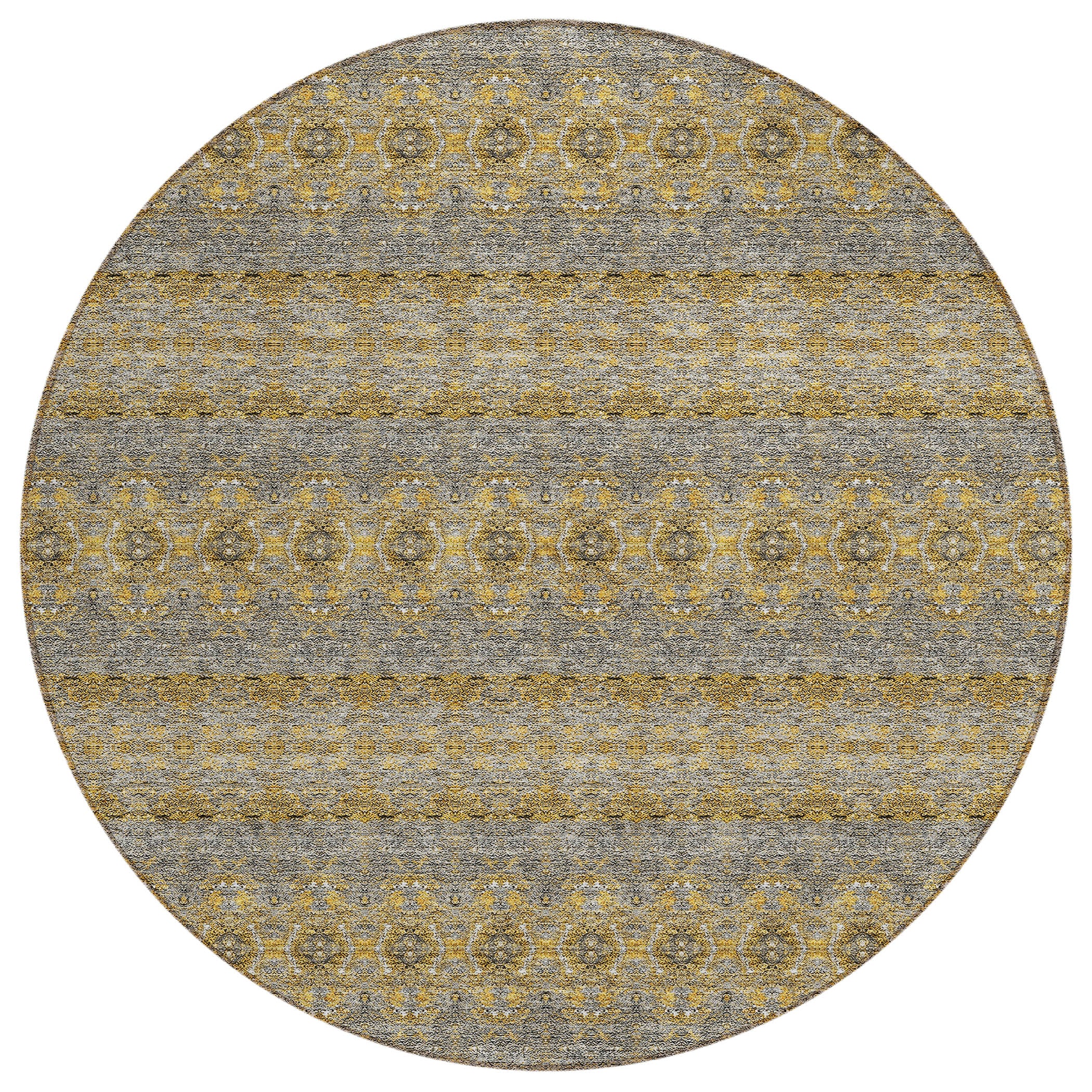 Chantille ACN615 Gold rug, a versatile and charming addition to your space. This transitional rug features small medallions that create a horizontal flow, perfect for adding a touch of bohemian style to any room. Combining old-world artistry with contemporary vibes, this rug is both durable and stylish.