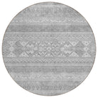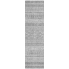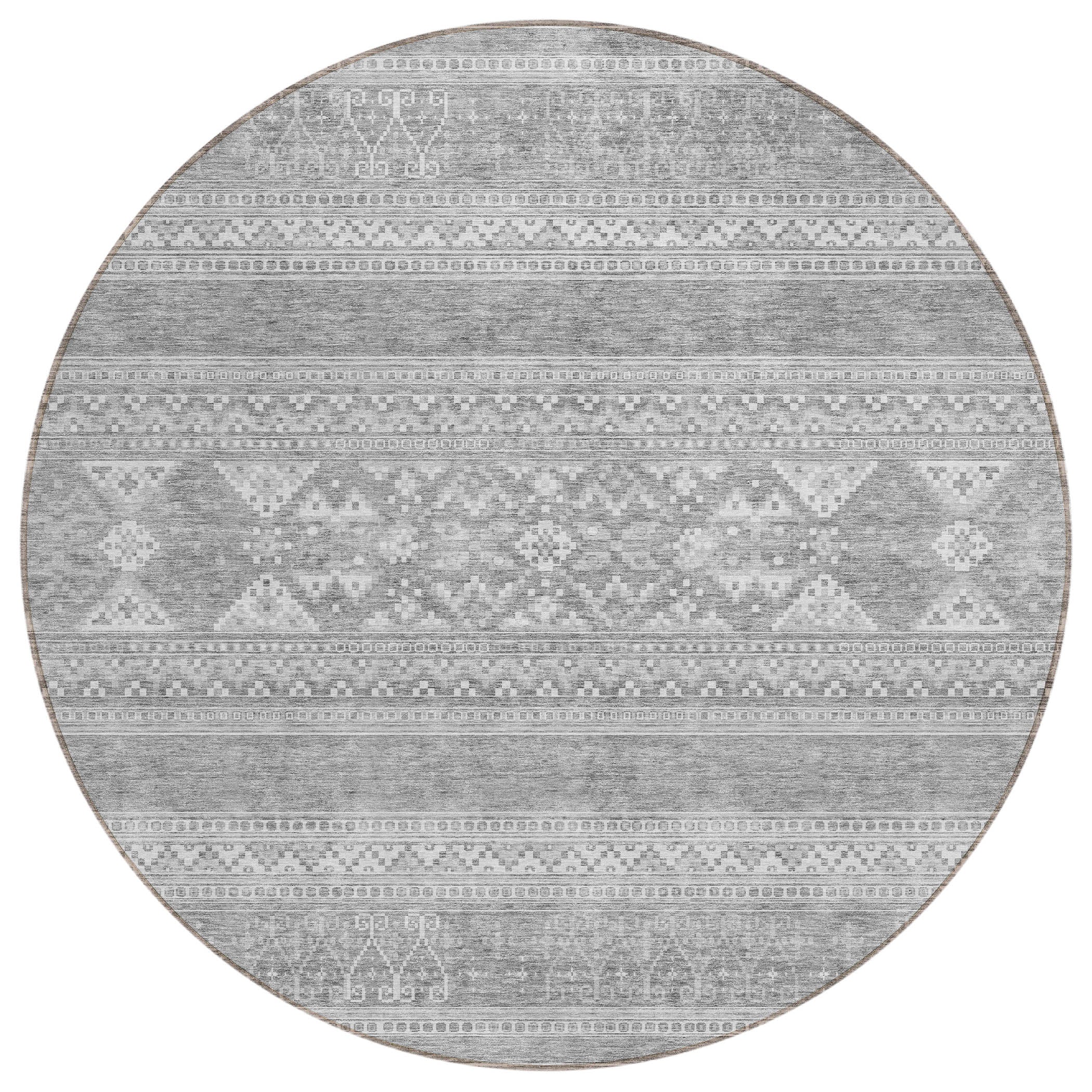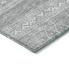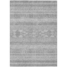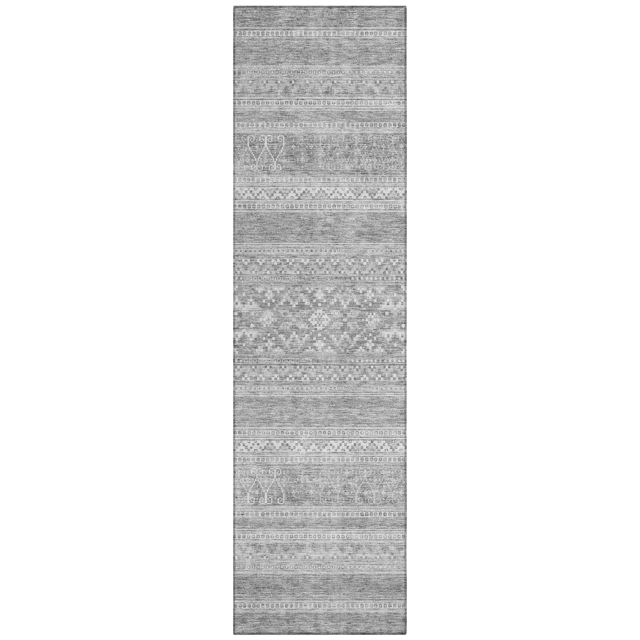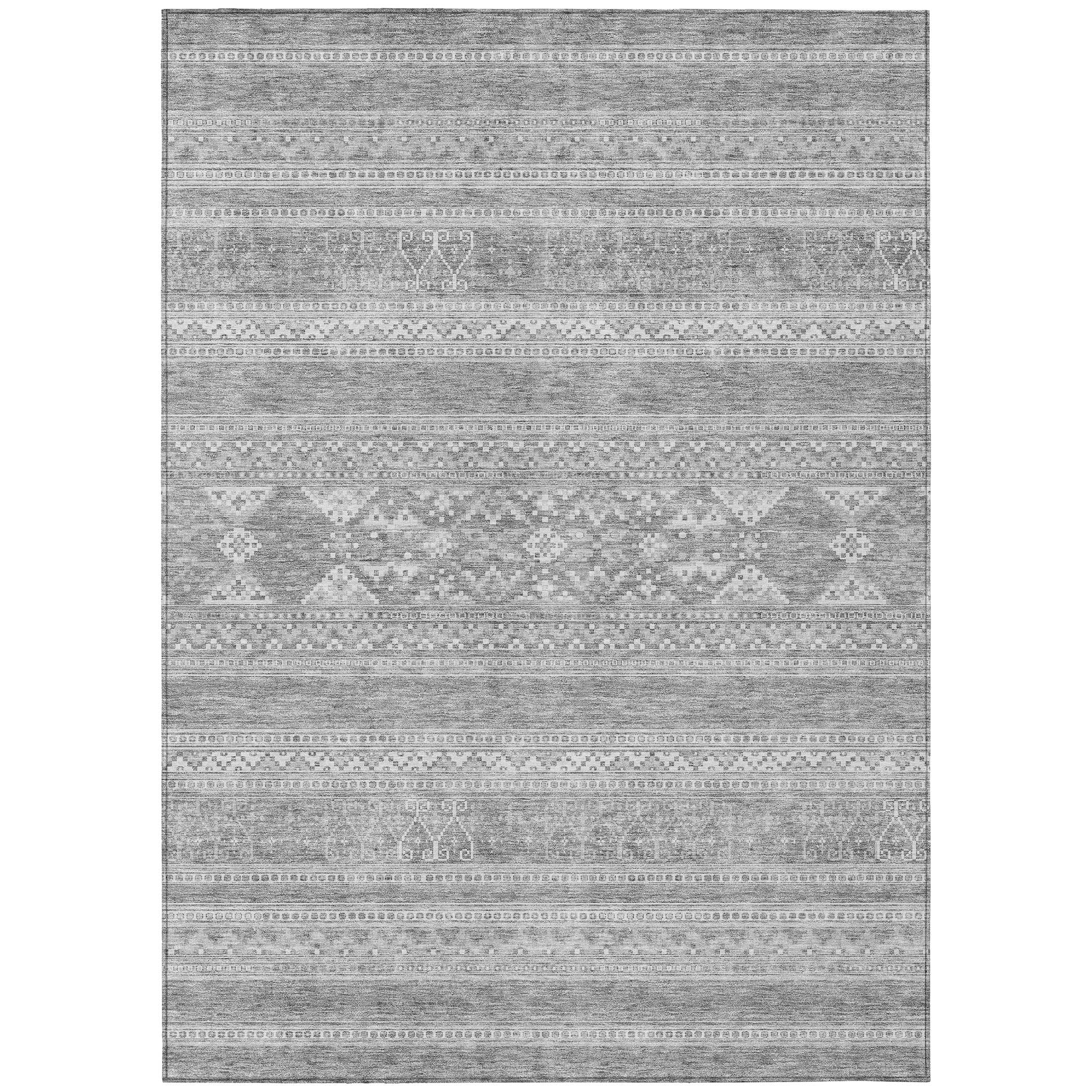 Chantille ACN714 Silver rug, a stunning piece that seamlessly blends modern design with southwest influences. The horizontal patterns pop against a chic graphic background, creating a visually captivating look that is perfect for any space. Whether used indoors or outdoors, its UV-resistant features keep it looking vibrant and fresh.