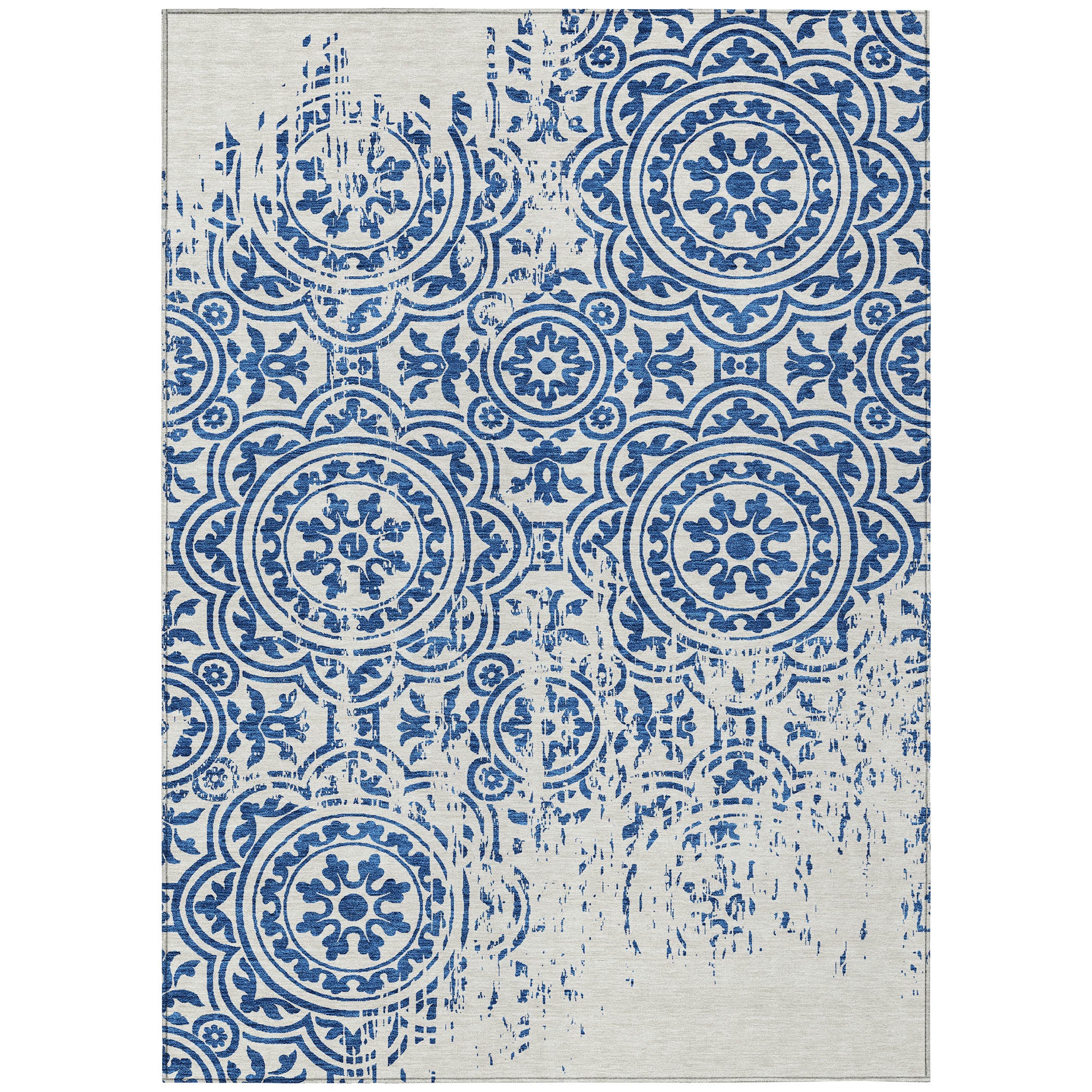 Chantille ACN758 Navy rug, a captivating addition to any space. The intricate design showcases large-scale medallions against open, airy corners, blending classic and contemporary charm effortlessly. Perfect for both indoor and outdoor use, this versatile rug features an ultra-thin construction that adds a touch of elegance to any room. Additionally, its machine-washable quality makes it easy to maintain, ideal for busy households with pets and children. Elevate your decor with this stylish and practical rug that combines beauty and functionality seamlessly.