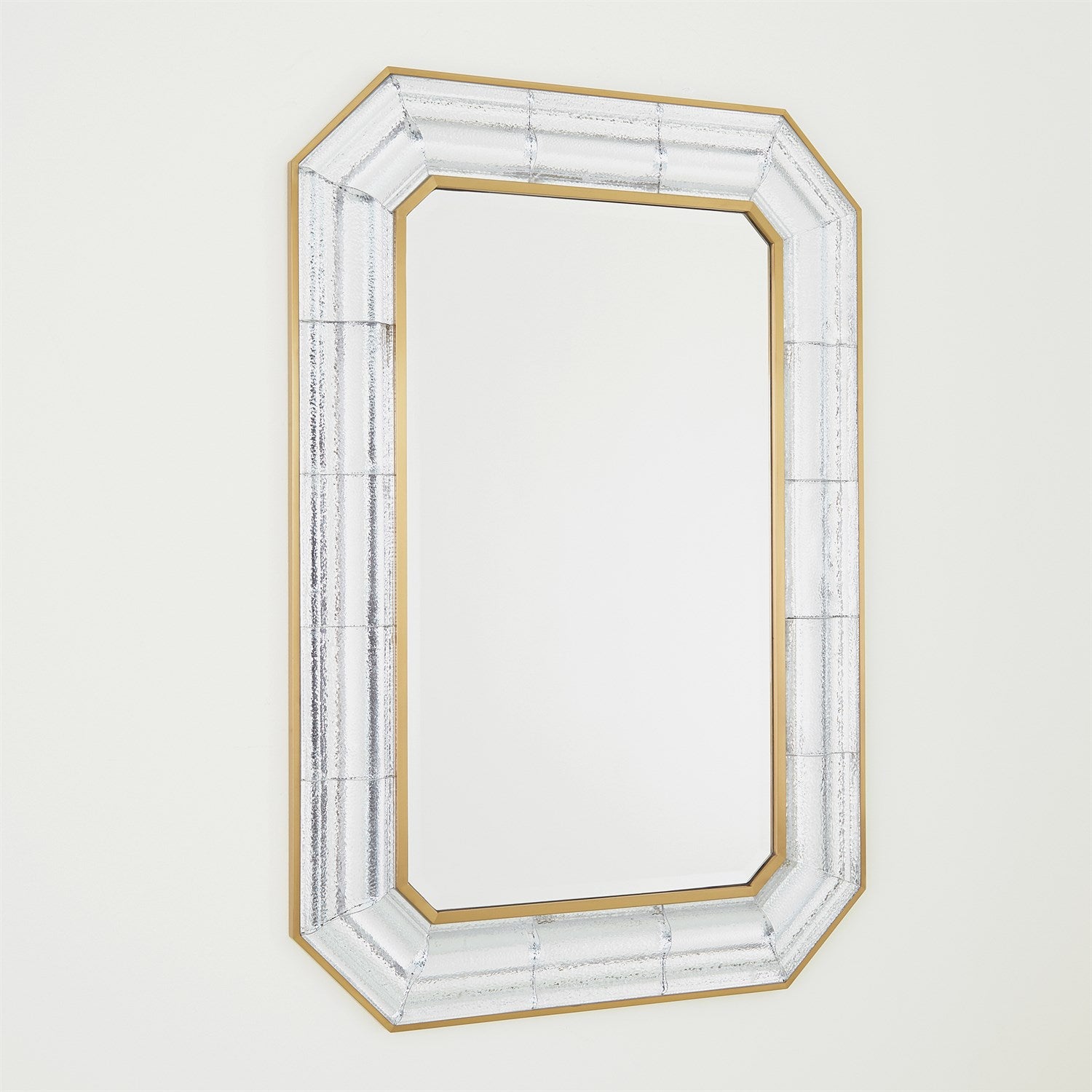 Inspired by architecture, our Cast Glass Mirror has 21 hand cut pieces of glass framed in a brushed brass frame. This piece is sure to add elegance and glamor to any room.