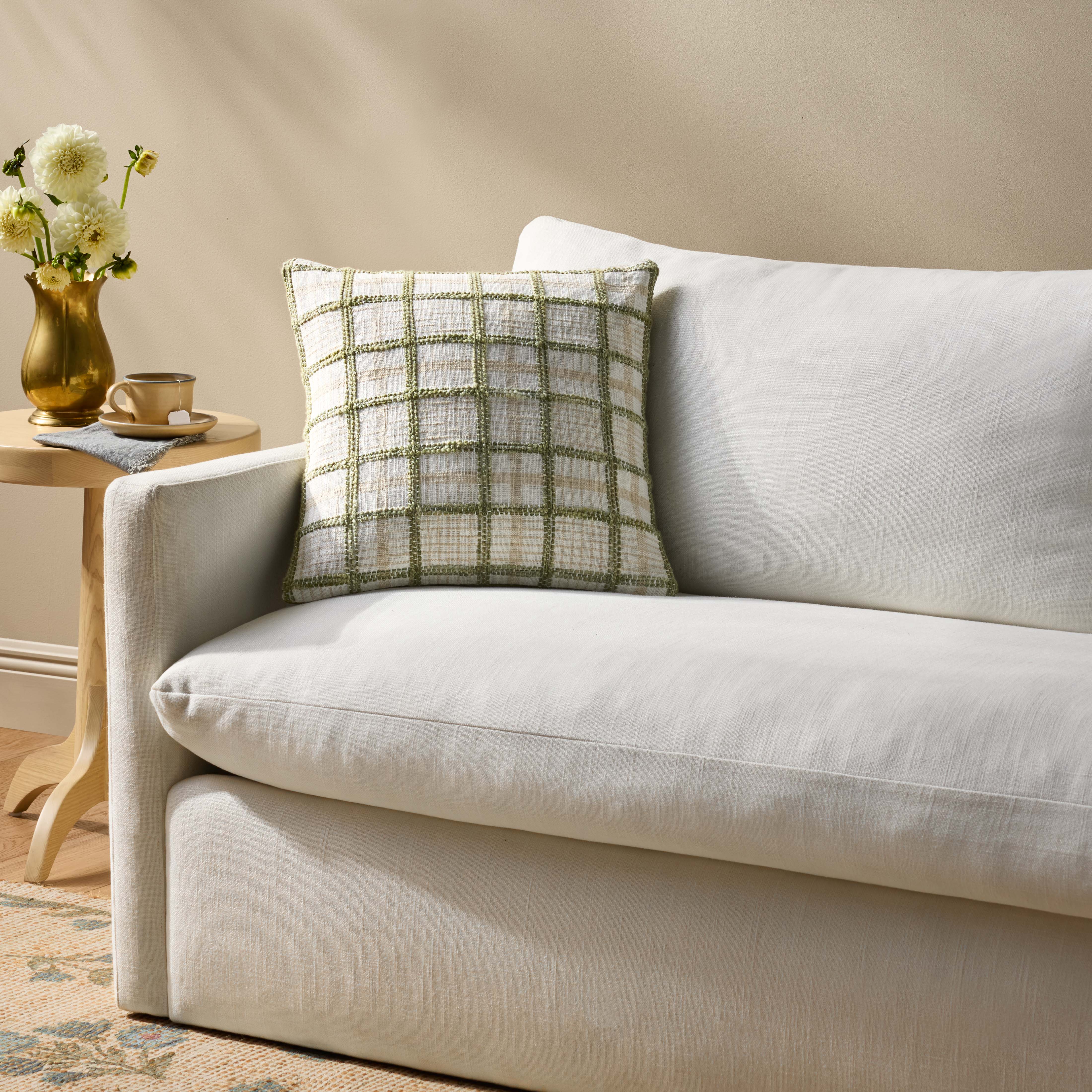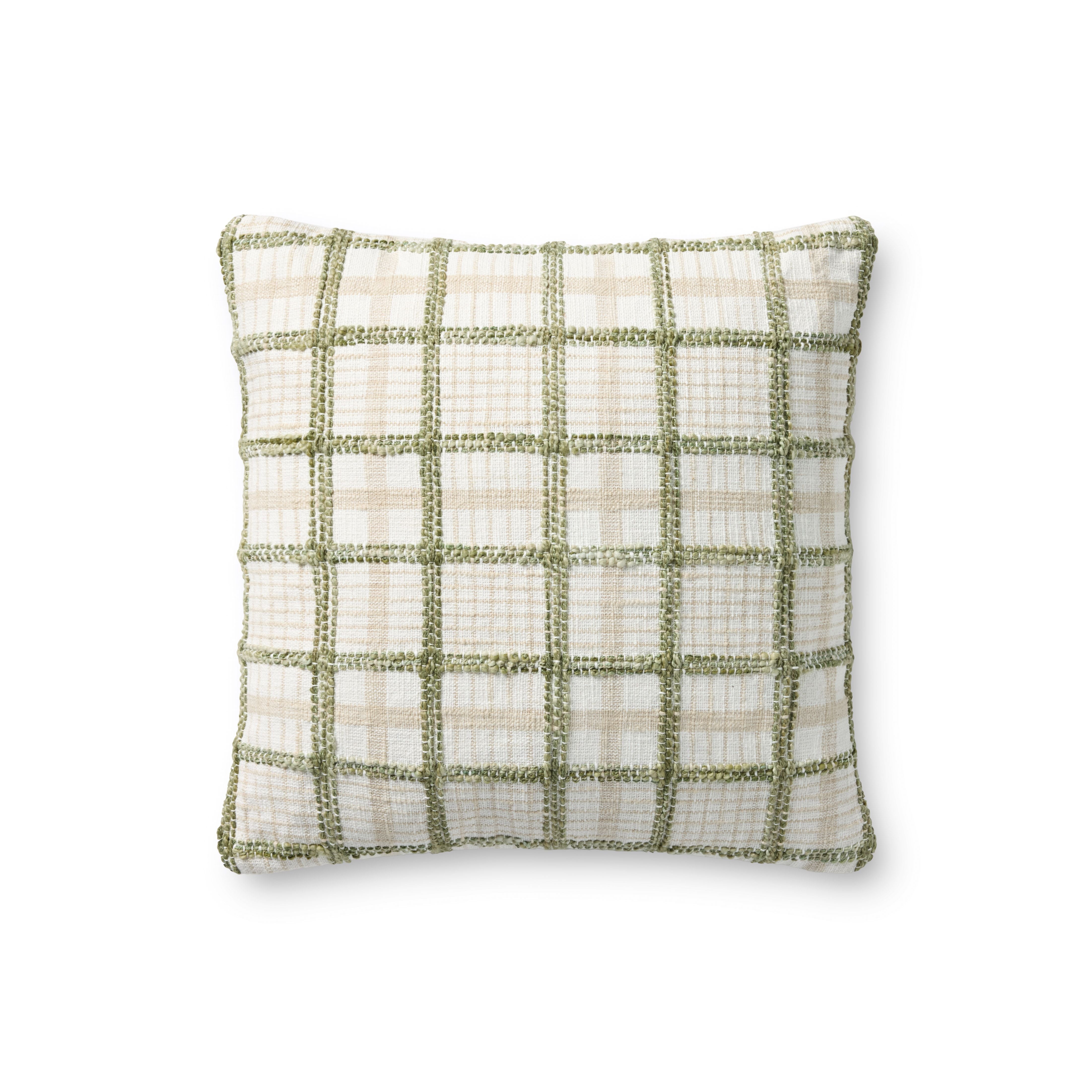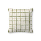 The Norman throw pillow by Chris Loves Julia x Loloi features a textured grid design with a soft color palette and white background, a versatile pillow for living rooms, dens, and bedrooms. The pillow cover is made of cotton and polyester in India and measures 18” x 18”.