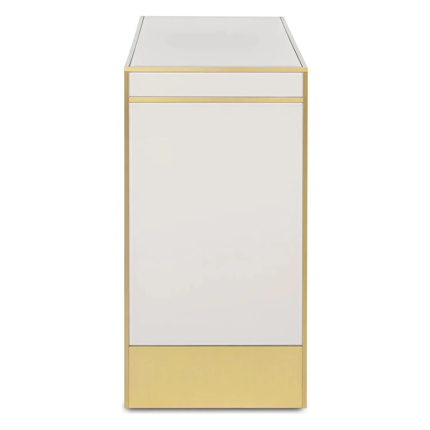 The Arden Console Table is inspired by a 1970s reverse-painted glass antique our director of furniture Aimee Kurzner found at the Paris flea market. The console features reverse-painted glass panels on the top, front, and sides with solid brass trim. The console table has a beveled top, and adjustable glides.