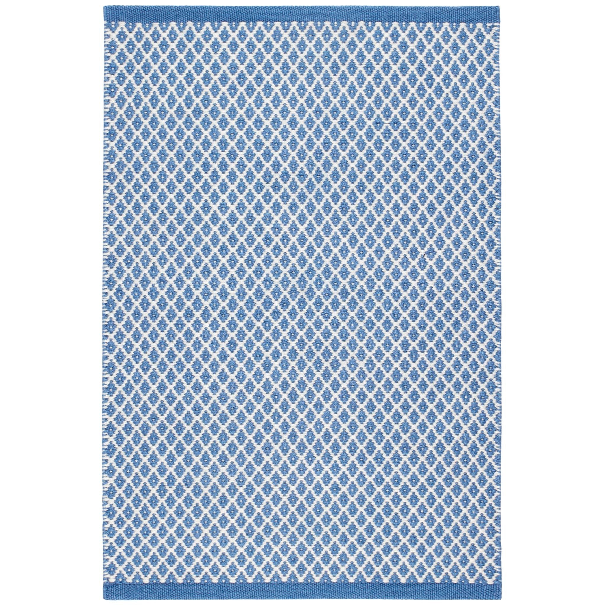A classic lattice diamond in versatile blue and ivory color combo offers subtle geometric interest on a durable and washable floor covering. Made of eco-friendly 100% PET, a soft-handed fiber from recycled plastic bottles.