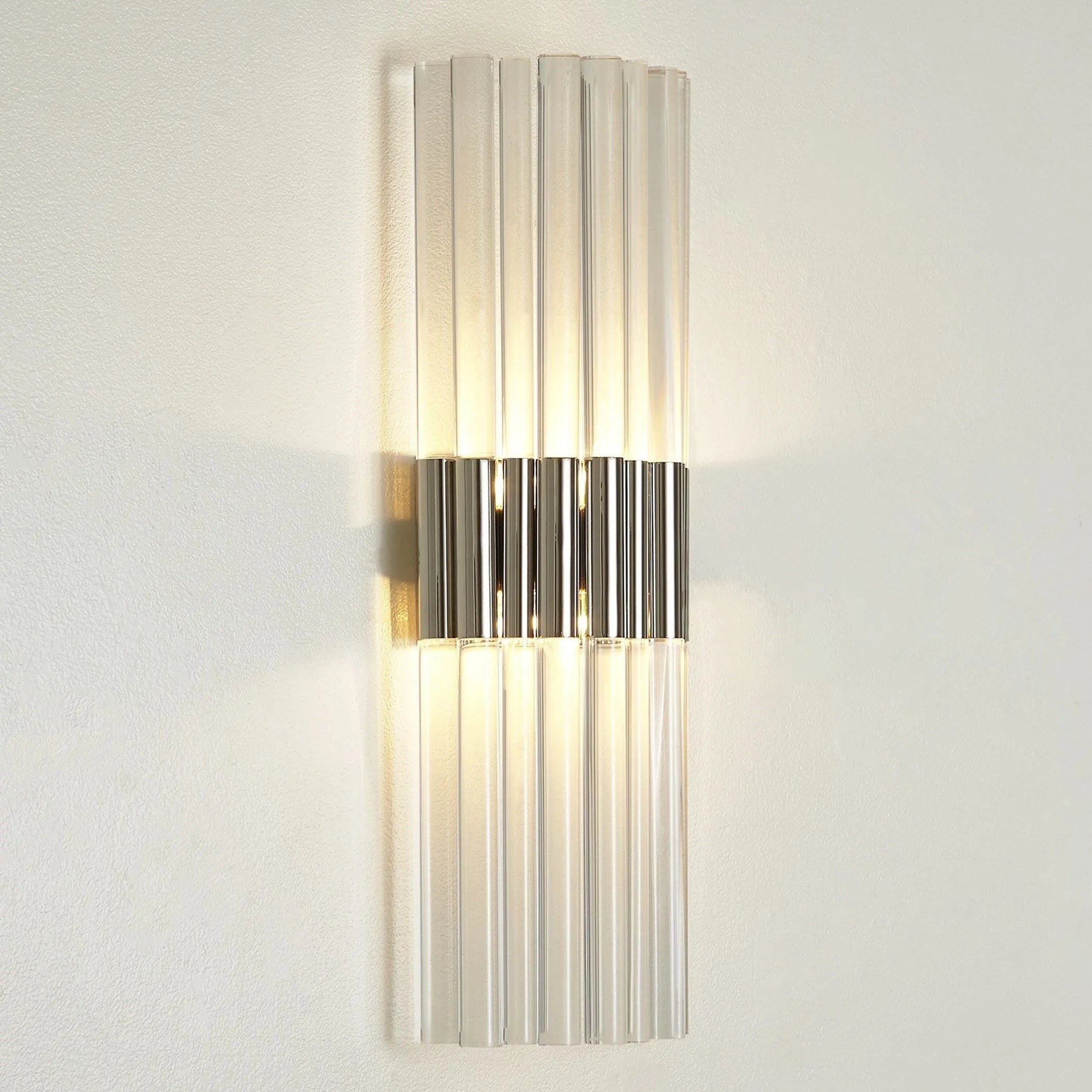 Acrylic Sconce — a sculptural wall light from Global Views that fuses modern hardware precision with luminous, architectural form. Vertical ribbed acrylic rods frame a polished metal center, creating a refined up-and-down glow that reads as both functional lighting and decorative object.