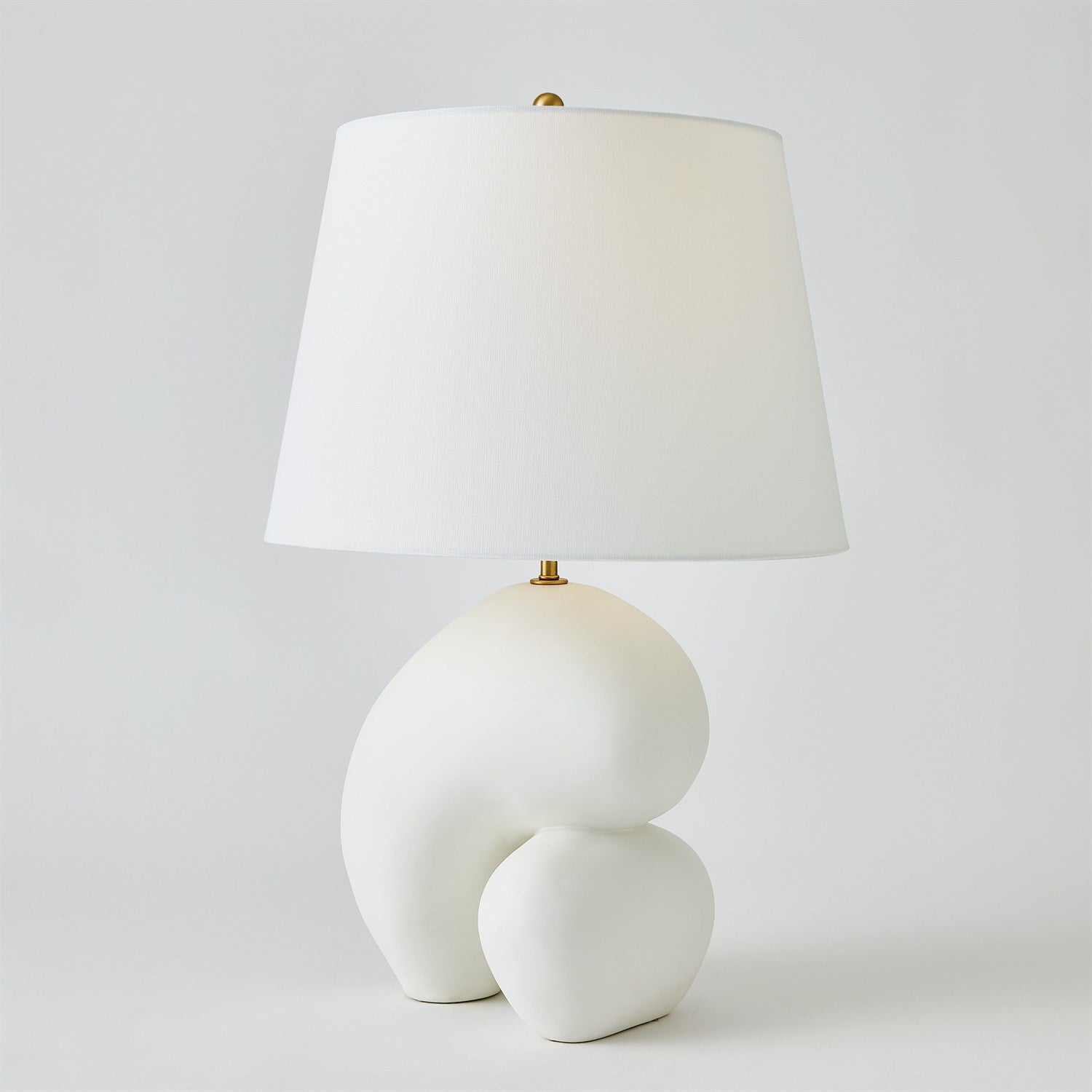 With its sinuous shape and unexpected proportions, our Muse lamp creates a beautiful, sculptural statement. The matte white glaze of the lamp body is accented with satin brass hardware and an ivory linen shade.