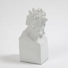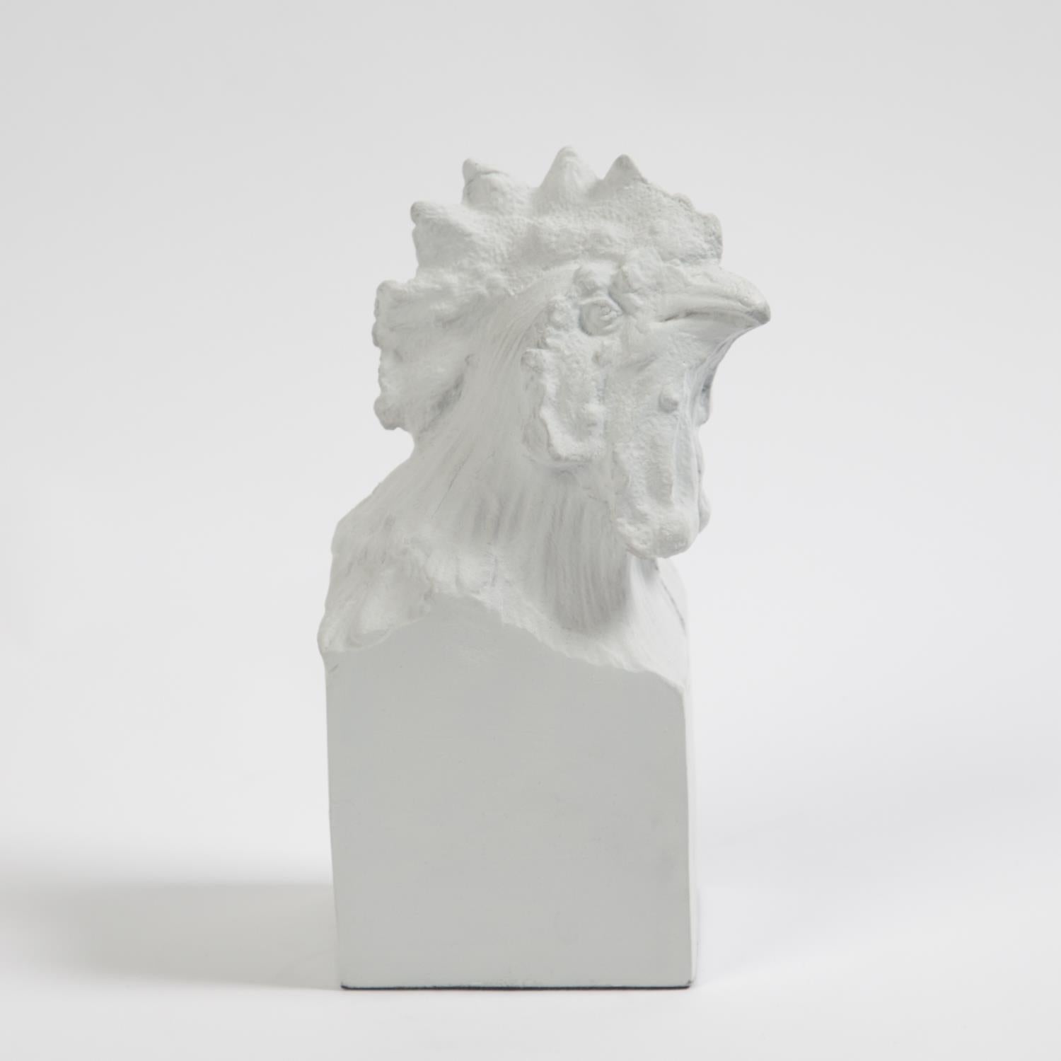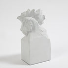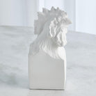 The Arete Collection is renowned for magnificently carved and hand-crafted home furnishings. This exclusive collection for William D Scott consists of nature-inspired accessories. This cast aluminum sculpture is covered in a matte white finish and resembles the head of a rooster resting atop a rectangular base. Felt tabs on the bottom of the sculpture help to protect any surface this piece rests upon.