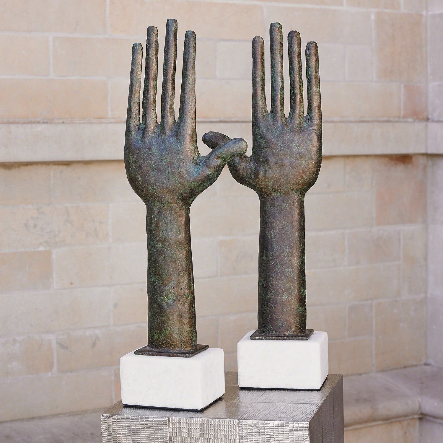 Primitive upstretched hands are a centuries-old representation of a connection between earth and a deity or greater power. These have a timeless verdigris finish and rest on honed white marble. Items sold individually.