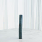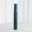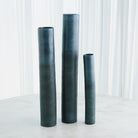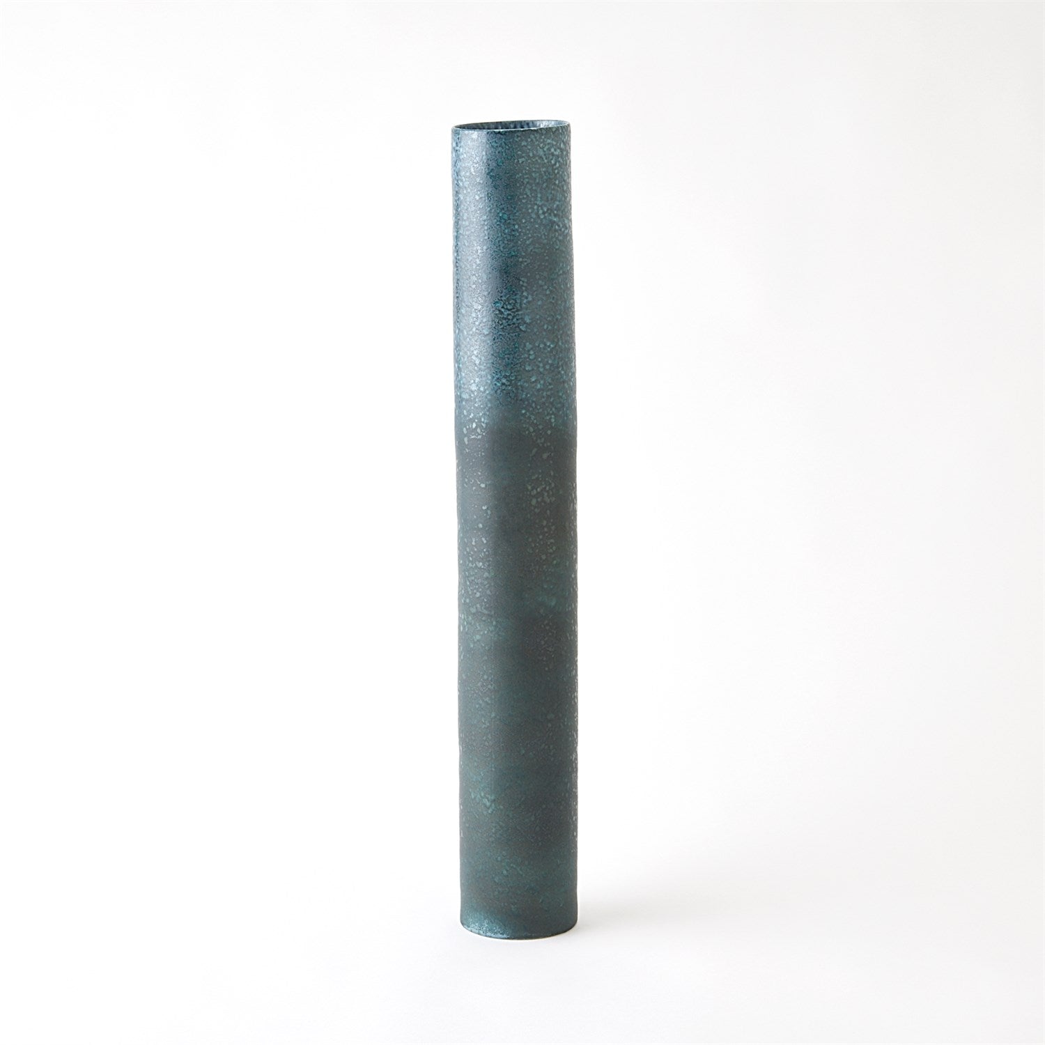 The Teeter Vases are beautifully crafted from slip-molded Portuguese porcelain, featuring a striking reactive glaze that blends mottled blues into a captivating bronze-blue metallic finish.
