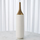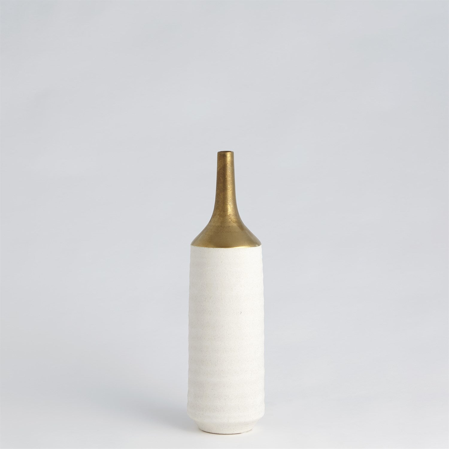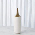 Our Two-Toned Vase is a slip-molded ceramic with a long, antiqued electroplated gold neck. A textured white glaze covers the remainder of the body.
