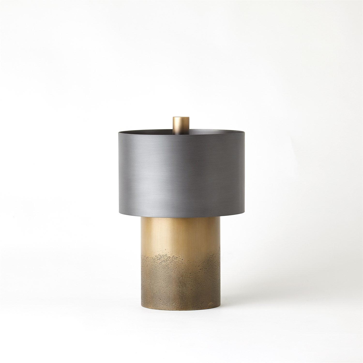 The bases of the Tortoise Drum lamps are constructed of thick sheet iron. Once completed, they are given an acid bath which produces a random, pitted texture in the metal which is enhanced by the antique brass finish. Bronze-finished metal shade. Antique Brass base. Bronze-finished finial.