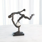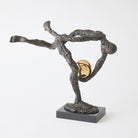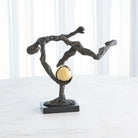 The Tripped Up Sculpture features a cast iron figure with a bronze finish, skillfully balancing a faux brass sphere on a sleek black marble base. This playful piece adds a touch of whimsy to any decor.