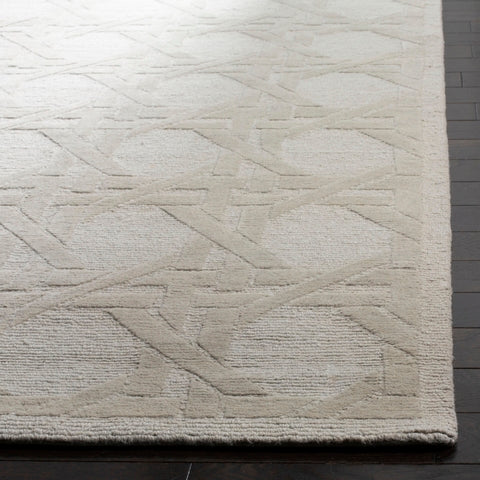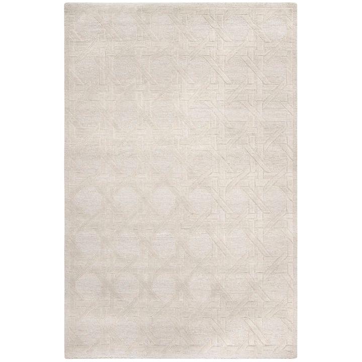 Jamie Drake JDK321C Silver rug, featuring a modern twist on the timeless Cane Weave design. Crafted from luxurious 100% wool, this rug showcases a bold interpretation of the woven cane motif in a larger-than-life scale. The intricate cut and loop weave is expertly hand-knotted in Nepal, ensuring top-notch quality and durability.