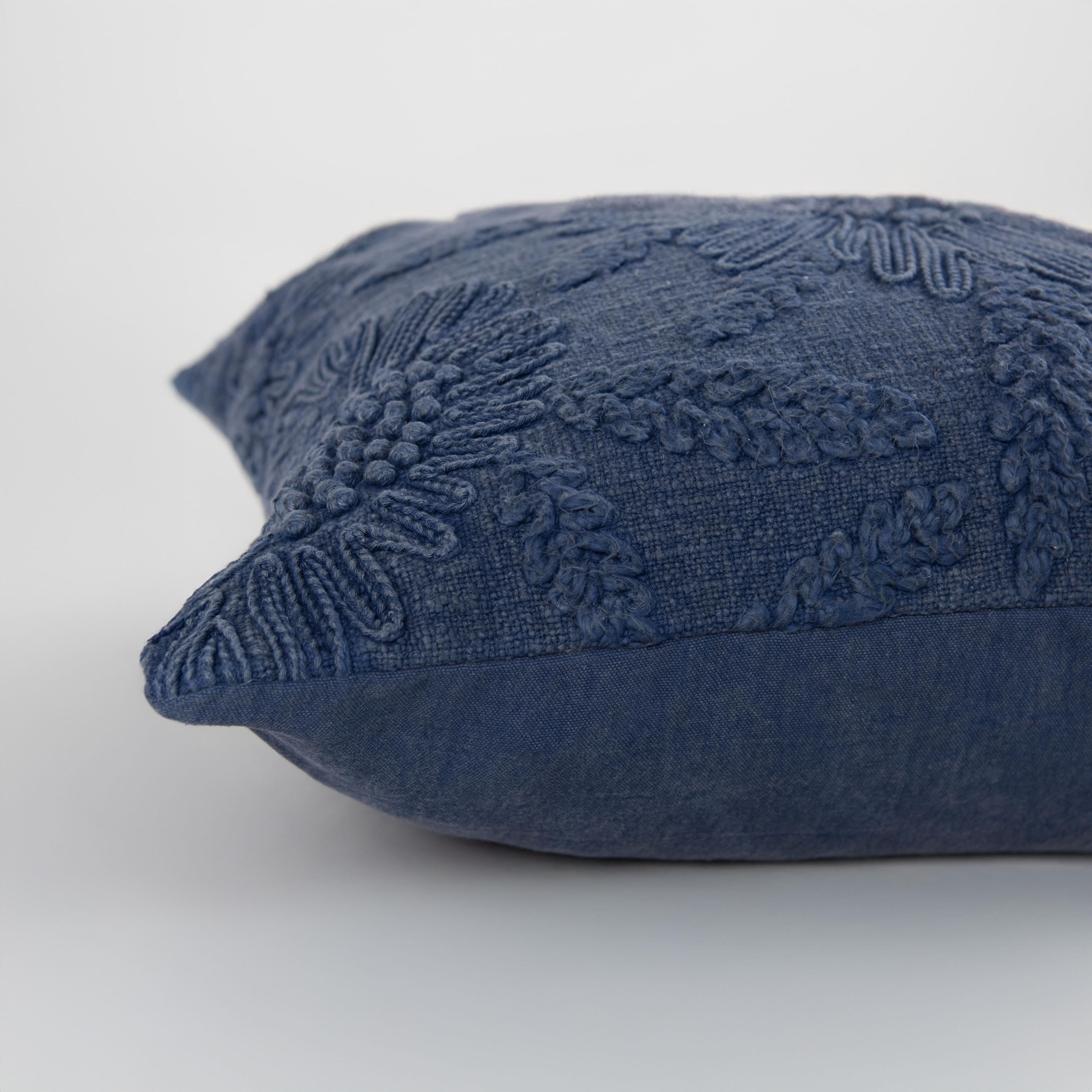 The 100% cotton fabric is adorned with a stunning embroidered botanical floral pattern, where cord embroidery forms the foundational texture, while hand-embroidered accents and hand-tied French knots add a delicate, artisanal touch. The monochromatic gray tone creates a soothing, cohesive look, and the solid cotton duck back with a hidden zipper closure ensures a seamless, polished finish. As a true work of stitched artistry, this pillow brings texture and elegance to any space.