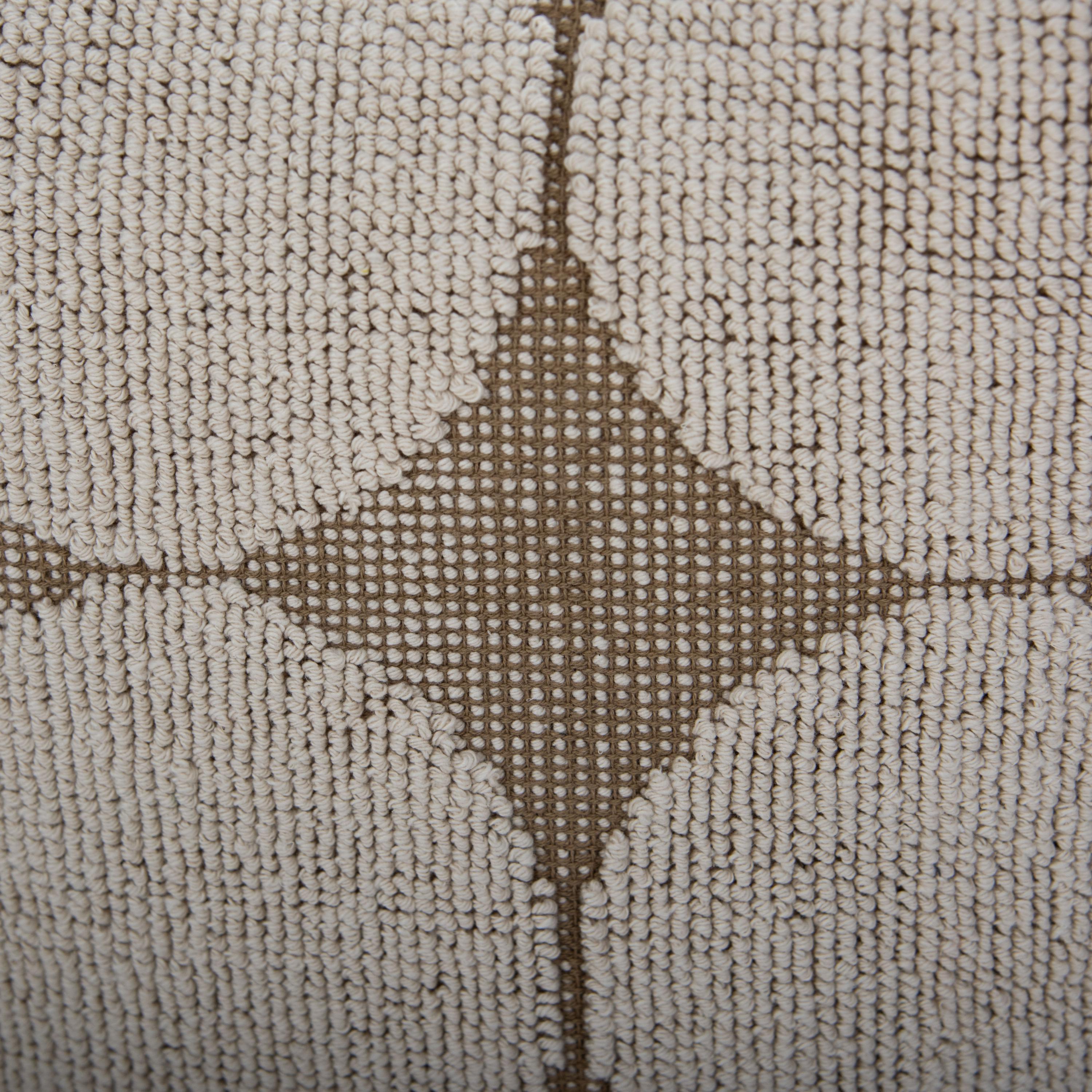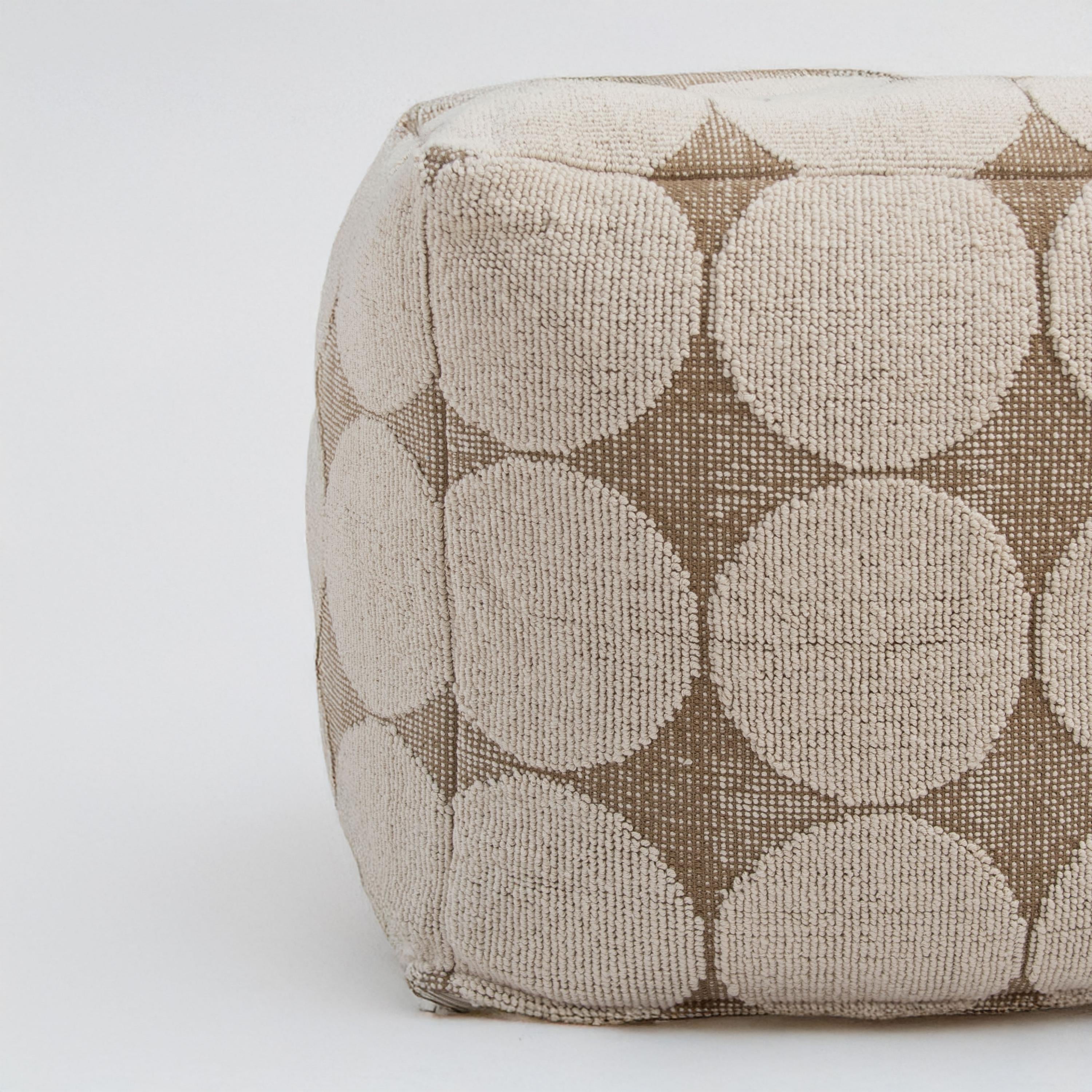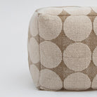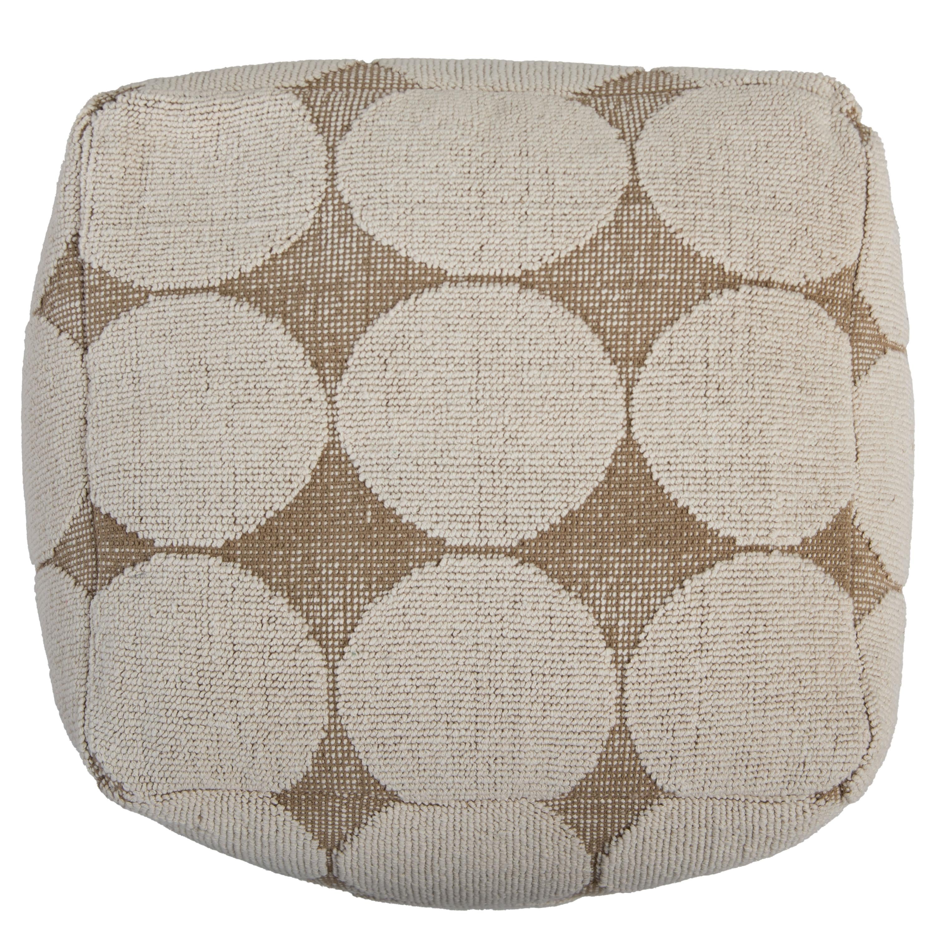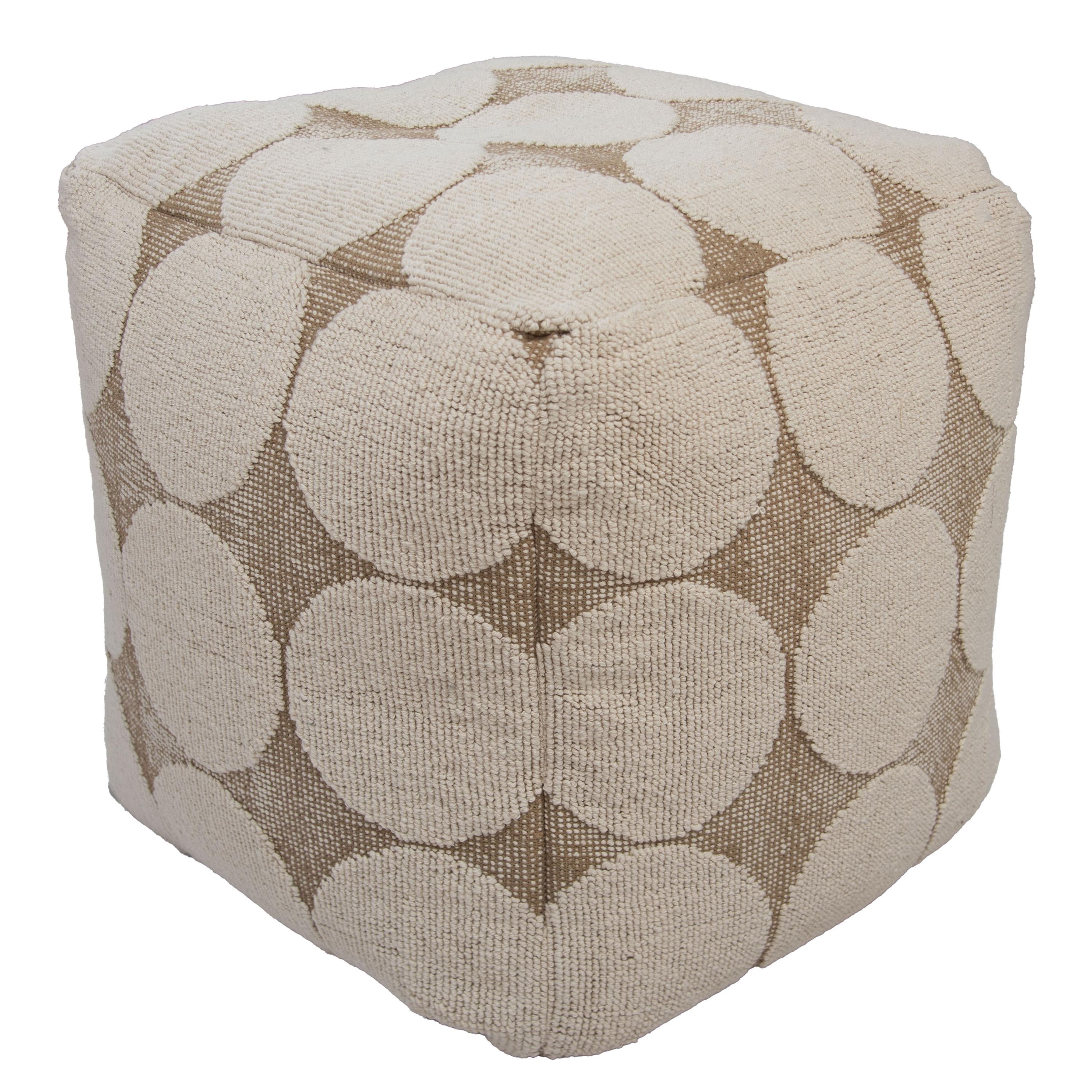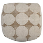 Add a playful yet sophisticated touch to your space with the Rizzy Home Pouf. This 18"x18"x18" hand-loomed piece combines a modern geometric design with a heavy texture, offering both style and functionality for any room. Crafted from a durable cotton-polyester blend, the pouf features a unique looped pattern with large, eye-catching circles that bring a fun and artistic flair to its natural hue. Its neutral color palette ensures seamless integration into a variety of design genres, making it a versatile artisanal accent for any decor. Whether used as extra seating, a cozy footrest in front of your favorite chair, or tucked neatly under a table, this pouf is as practical as it is stylish. With an inner lining, a secondary inner lining that secures the polystyrene bead fill, and a securely locked zipper, it’s as durable as it is stylish. The recycled canvas bottom adds an eco-friendly touch. Spot-clean only, the Rizzy Home Pouf effortlessly blends function and fun, making it the perfect finishing touch for your modern home.