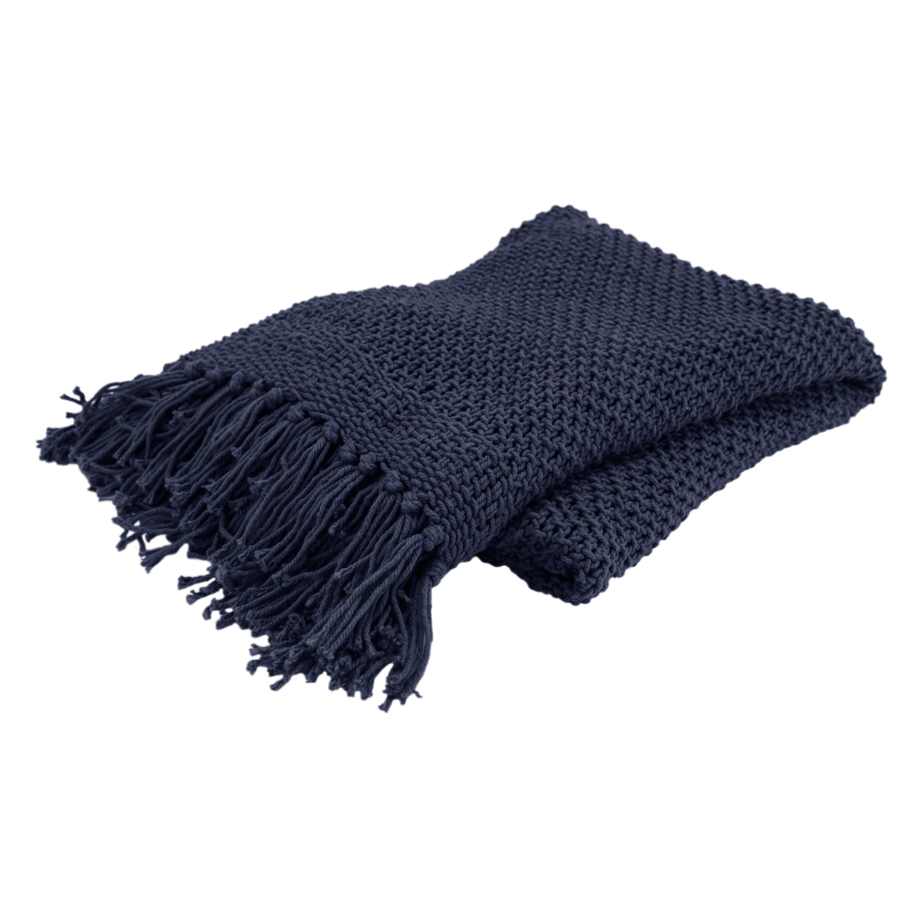 Wrap yourself in comfort and style with this 50" x 60" indigo open dense net-like patterned throw from Rizzy Home. Modern industrial meets contemporary style inspiration with elevated craftsmanship in the flat woven edging and fringe with hand tied tasseling accents. This throw is elegant and urbane as an addition to any chaise, bedding or seating arrangement while also adding an element of coziness and warmth to any home décor.