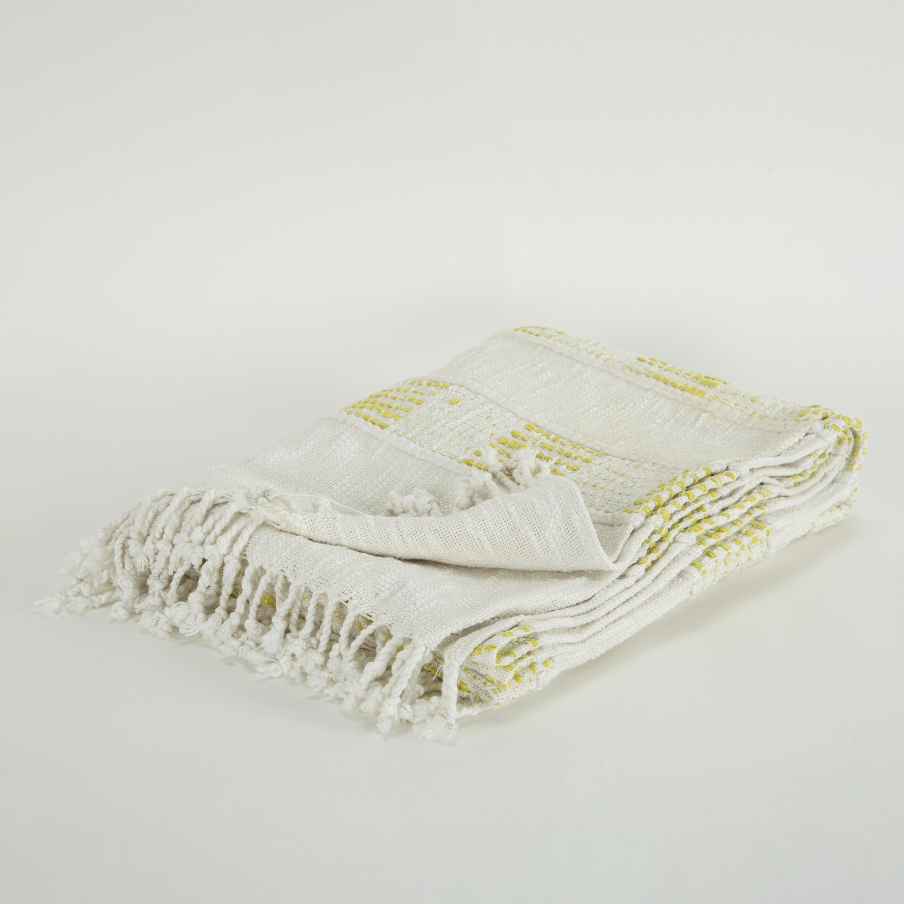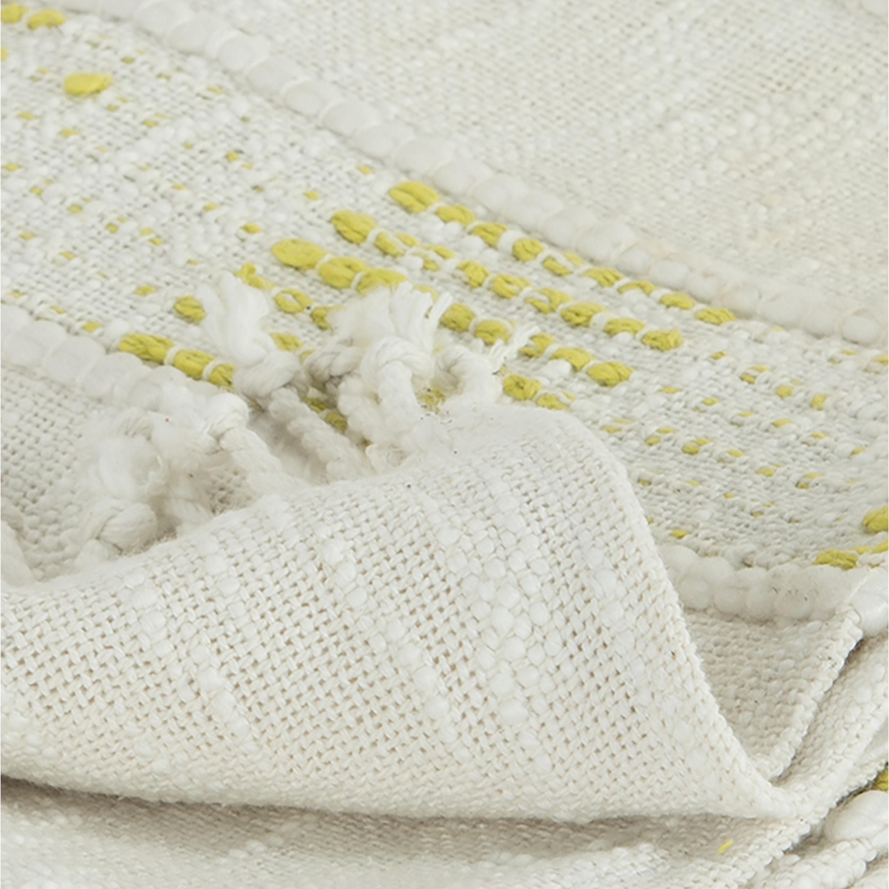 This cozy hand loomed throw is perfect for snuggling up on a cold winter night. Because it's crafted by hand, each throw is unique for a special artisanal piece that you can cherish for years to come. The classic modern striped pattern in yellow and natural will complement a variety of home design styles, alone or layered. The modern industrial and shabby chic vibe make this a must-have for any comfy living space. Expertly crafted with color woven into the fabric, warp yarns, chunky cotton, and twisted and tied fringe accents, this throw is a work of art that will elevate the look and feel of any room. Whether you're snuggling up with a good book, watching a movie, or simply relaxing on the couch, this Rizzy Home throw will make a beautiful addition to your home decor collection.