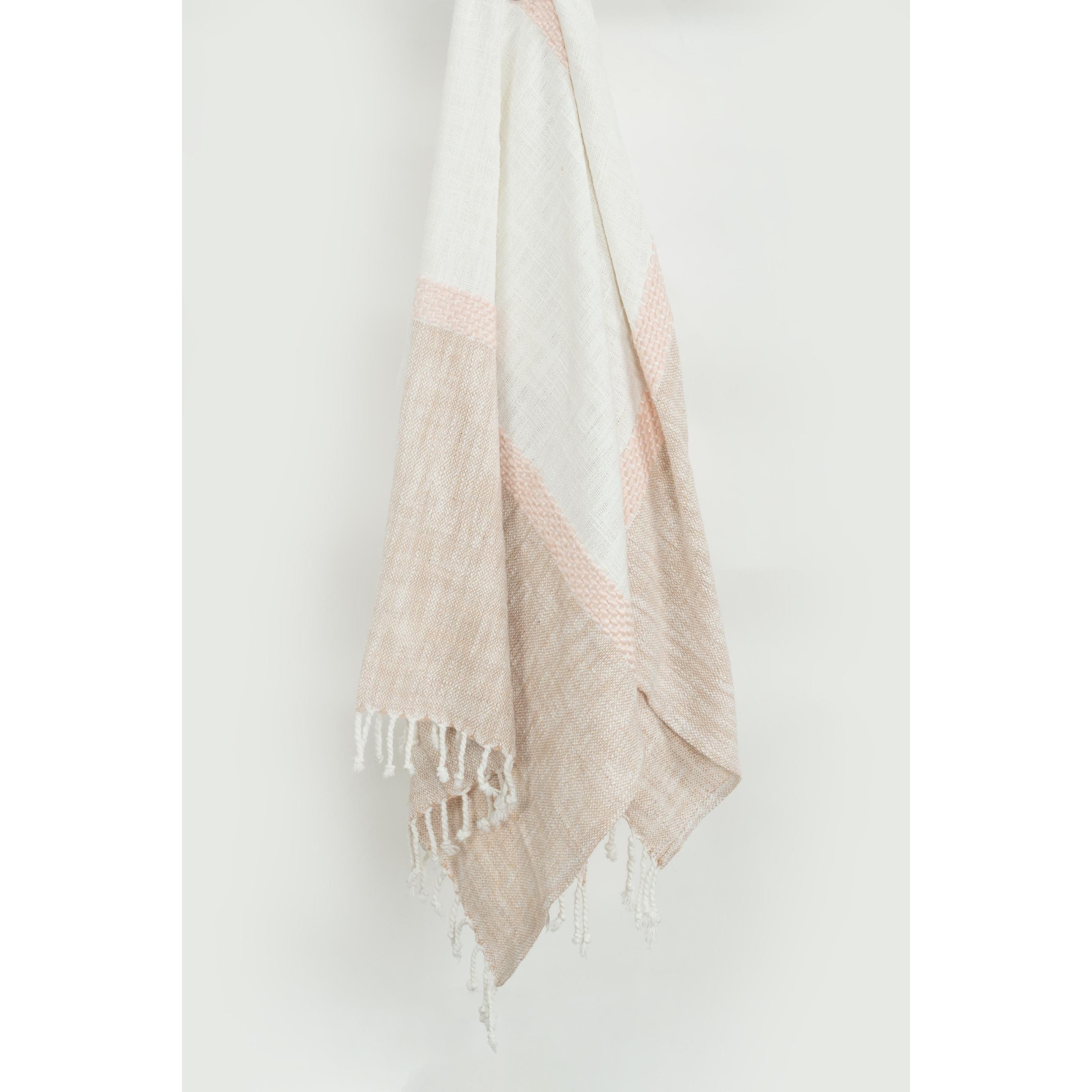 This Rizzy Home hand-loomed cotton throw is a must-have for anyone who values style, comfort, and quality craftsmanship. Measuring 50" x 60", this throw is super soft to the touch and lightweight for ultimate comfort. Hand crafted for the highest quality with attention to detail, this throw showcases a refined elegant aesthetic that is both contemporary and timeless. The gorgeous color block design features striped patterning that seamlessly blends shades of blush and natural hues for a sophisticated finish. The artisanal style is further enhanced by the warp hand-tied tassel fringe, which gives this piece a charming and rustic feel. This throw is perfect for draping over your favorite chair or sofa, or adding a touch of elegance and warmth to any chic space. Snuggle up in its soft and cozy texture while enjoying a good book, watching your favorite movie, or enjoying a glass of wine on your patio on a cool evening. This Rizzy Home throw will last for years to come, and can transform any living space into a cozy sanctuary.