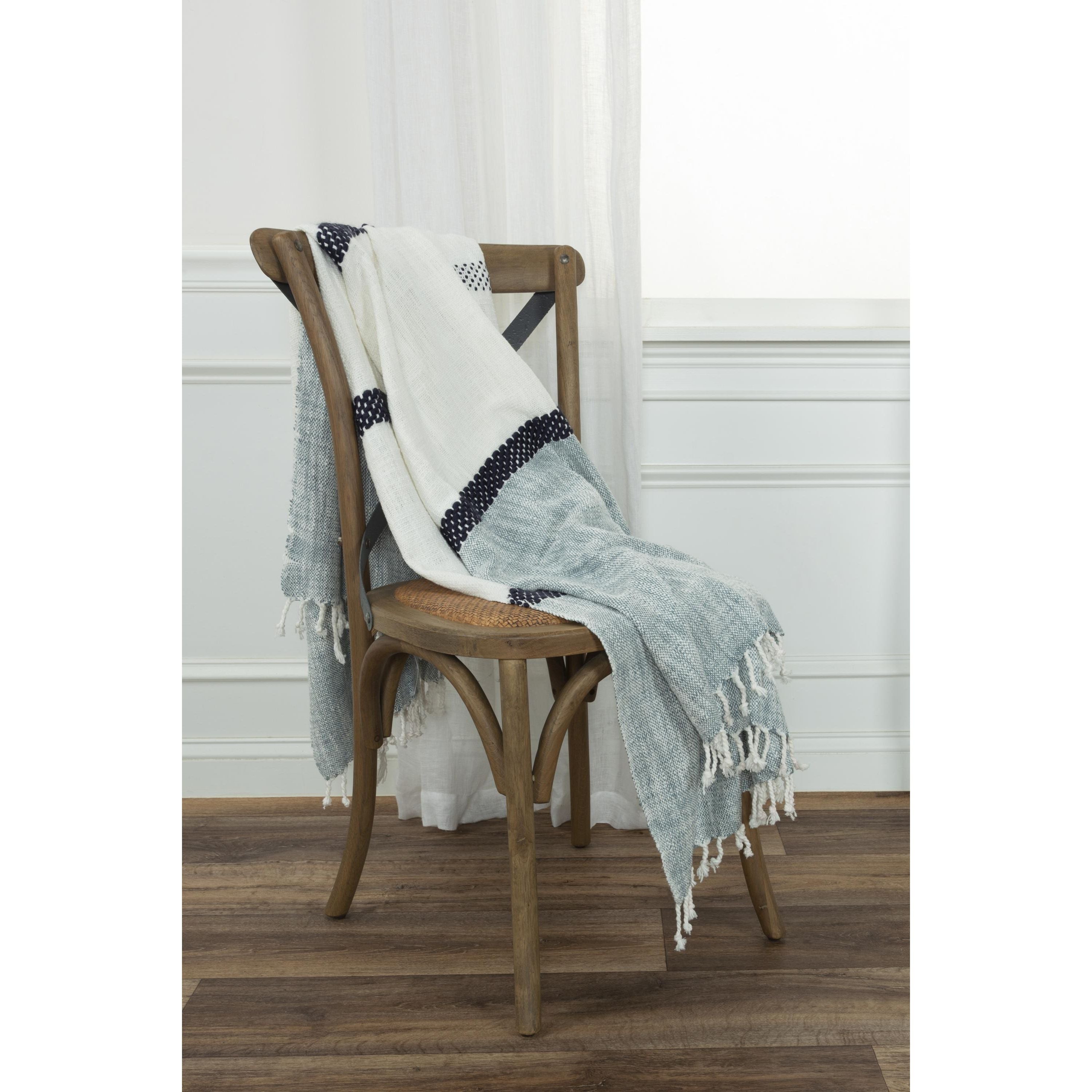 This Rizzy Home hand-loomed cotton throw is a must-have for anyone who values style, comfort, and quality craftsmanship. Measuring 50" x 60", this throw is super soft to the touch and lightweight for ultimate comfort. Hand crafted for the highest quality with attention to detail, this throw showcases a refined elegant aesthetic that is both contemporary and timeless. The gorgeous color block design features striped patterning that seamlessly blends shades of navy blue and natural hues for a sophisticated finish. The artisanal style is further enhanced by the warp hand-tied tassel fringe, which gives this piece a charming and rustic feel. This throw is perfect for draping over your favorite chair or sofa, or adding a touch of elegance and warmth to any chic space. Snuggle up in its soft and cozy texture while enjoying a good book, watching your favorite movie, or enjoying a glass of wine on your patio on a cool evening. This Rizzy Home throw will last for years to come, and can transform any living space into a cozy sanctuary.