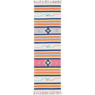 Baja BAJ01 Ivory area rug from our vibrant tribal-inspired collection. This Ikat style rug boasts a stunning rainbow of colors, including primary shades of red, yellow, and blue, complemented by hints of orange, turquoise, and pink set against a soft ivory background. The eclectic mix of hues adds a touch of Moroccan flair to your space, creating a lively atmosphere. Crafted with a flat weave design, this kilim rug exudes casual elegance perfect for any room in your home.