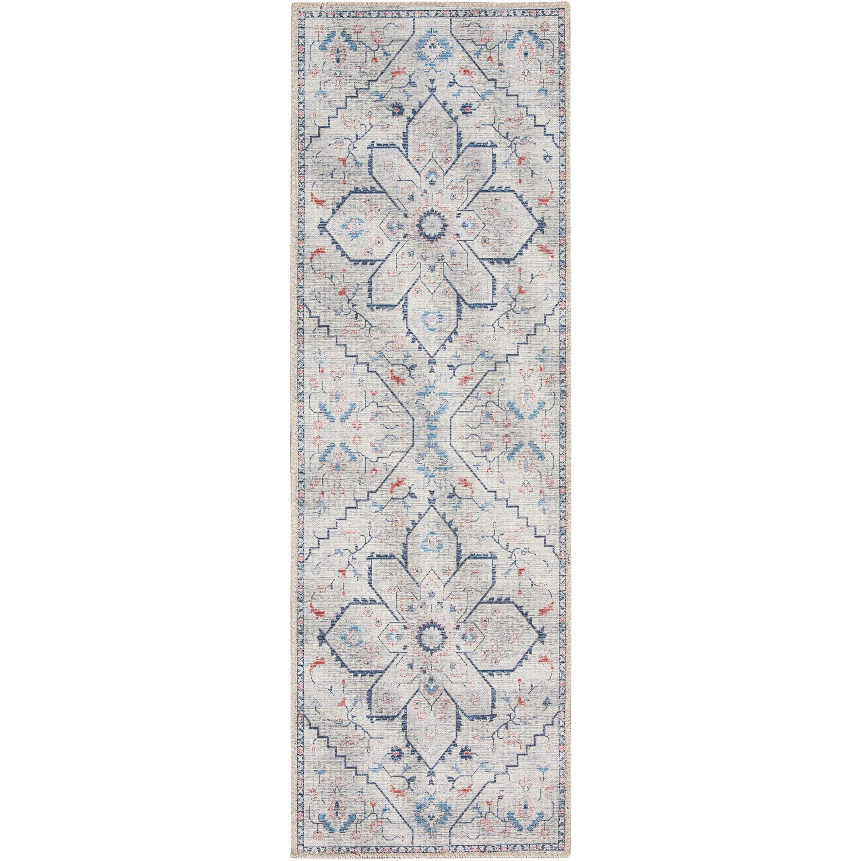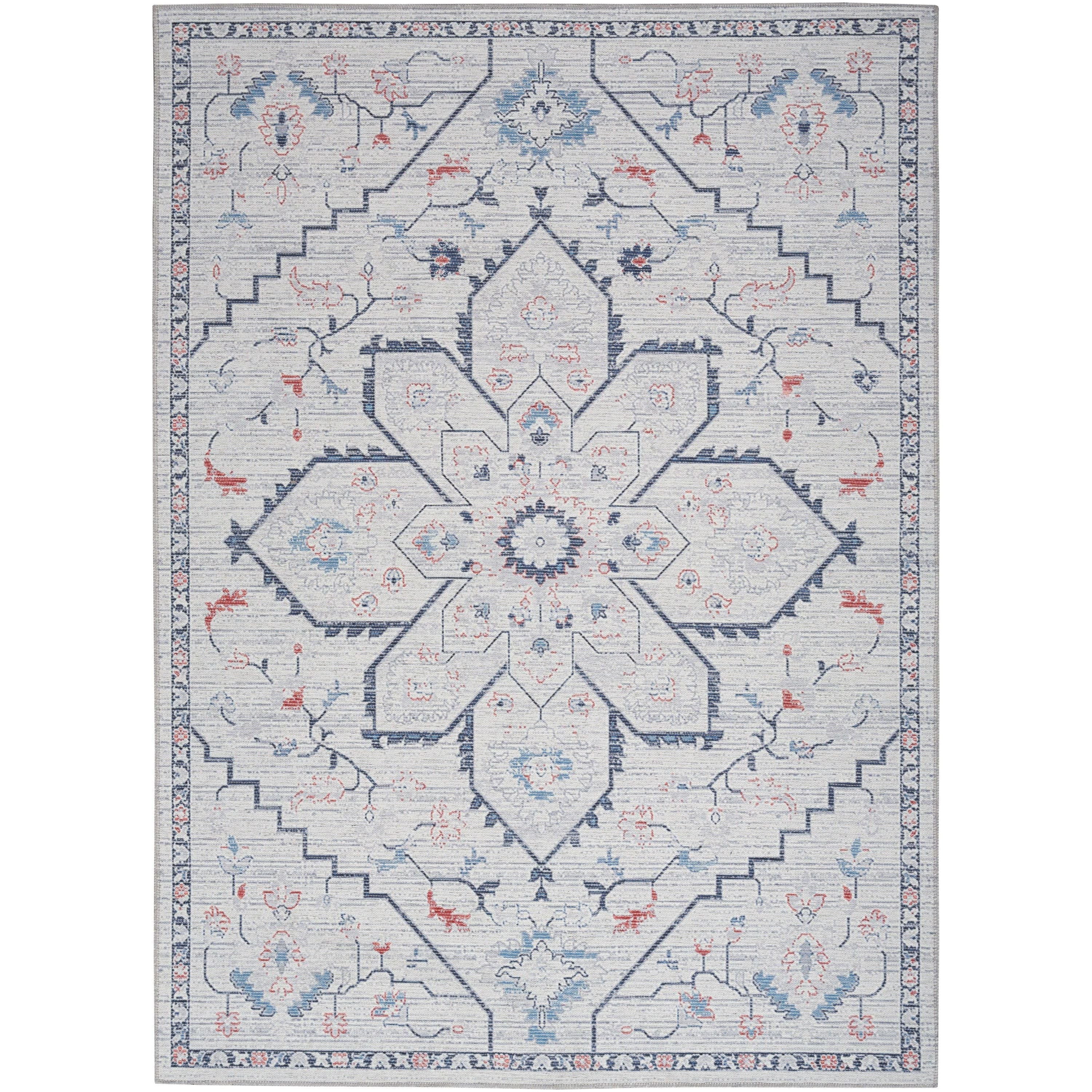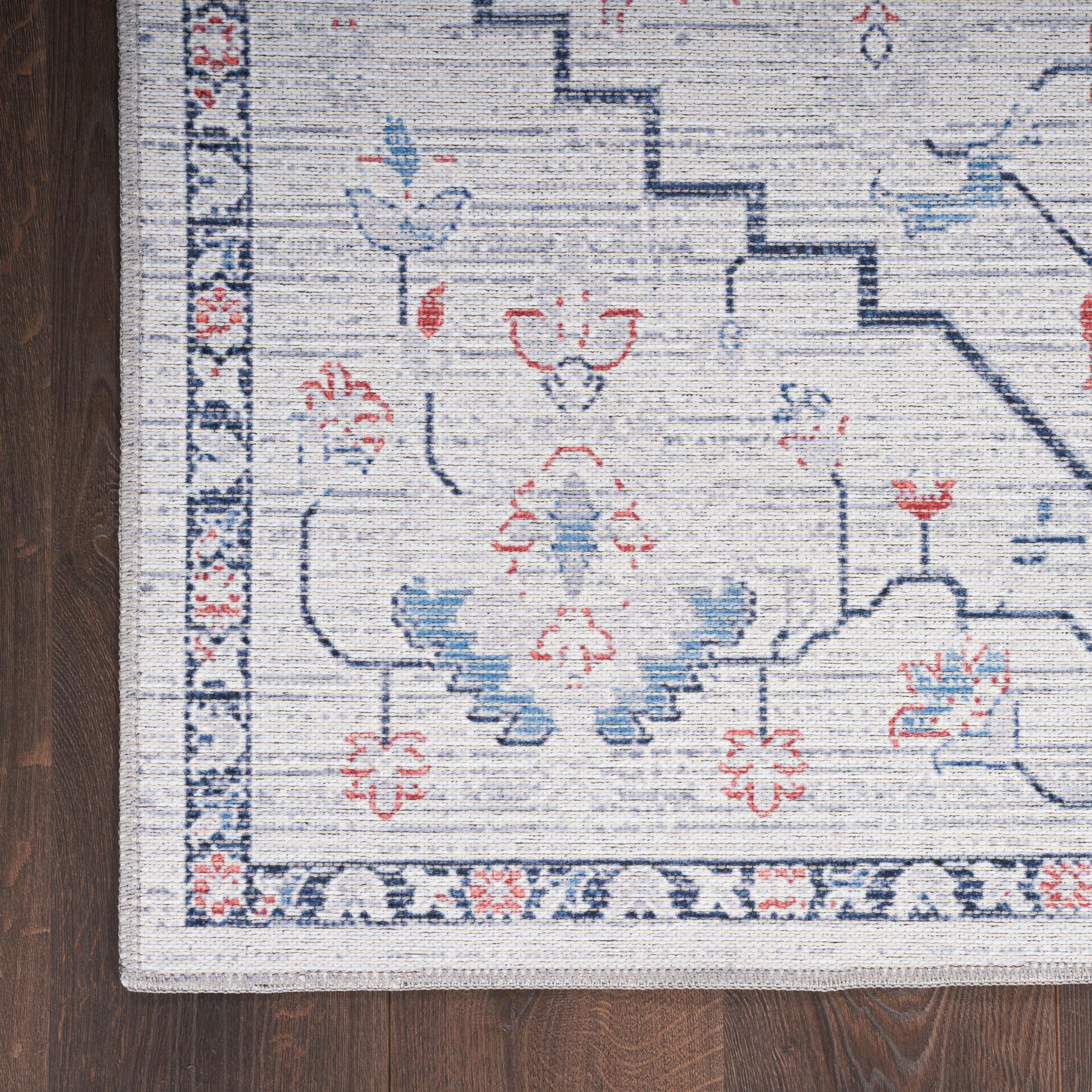Machine Washable Series 1 SR110 Ivory Blue rug from the Nicole Curtis collection. Inspired by the rich history of Persian floral and tribal designs, this timeless rug collection is a perfect way to add character to your home. Renowned designer Nicole Curtis believes that every home has a unique story to tell, and these vintage-inspired rugs help you create your own narrative.