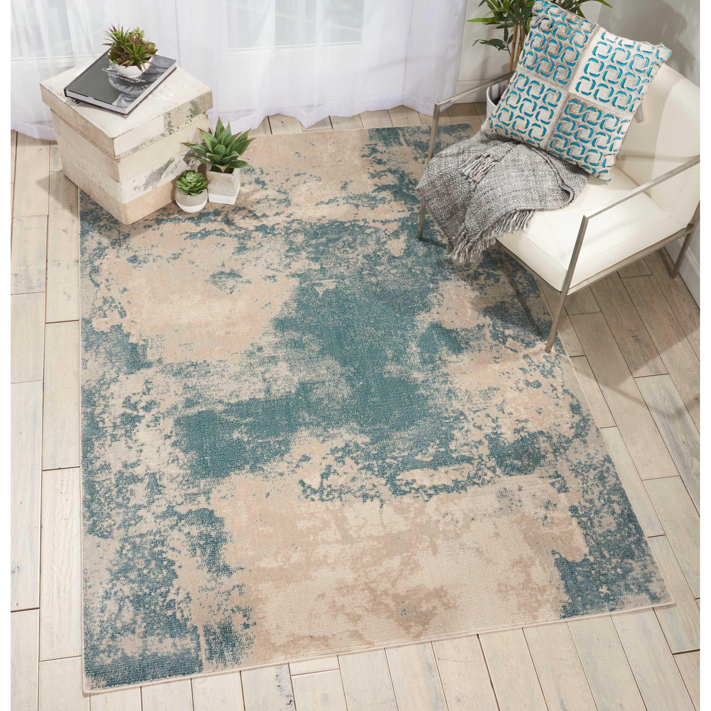 Elevate your living space with the Maxell MAE13 Ivory Teal area rug from the exquisite Maxell Collection. This rug features a beautiful blend of transitional shadings and ombre effects, adding a unique dimension to any room, whether it's eclectic or contemporary in style. The soft, muted tones of smoky ivory and teal make a bold statement of artistry that will enhance the ambiance of your space.