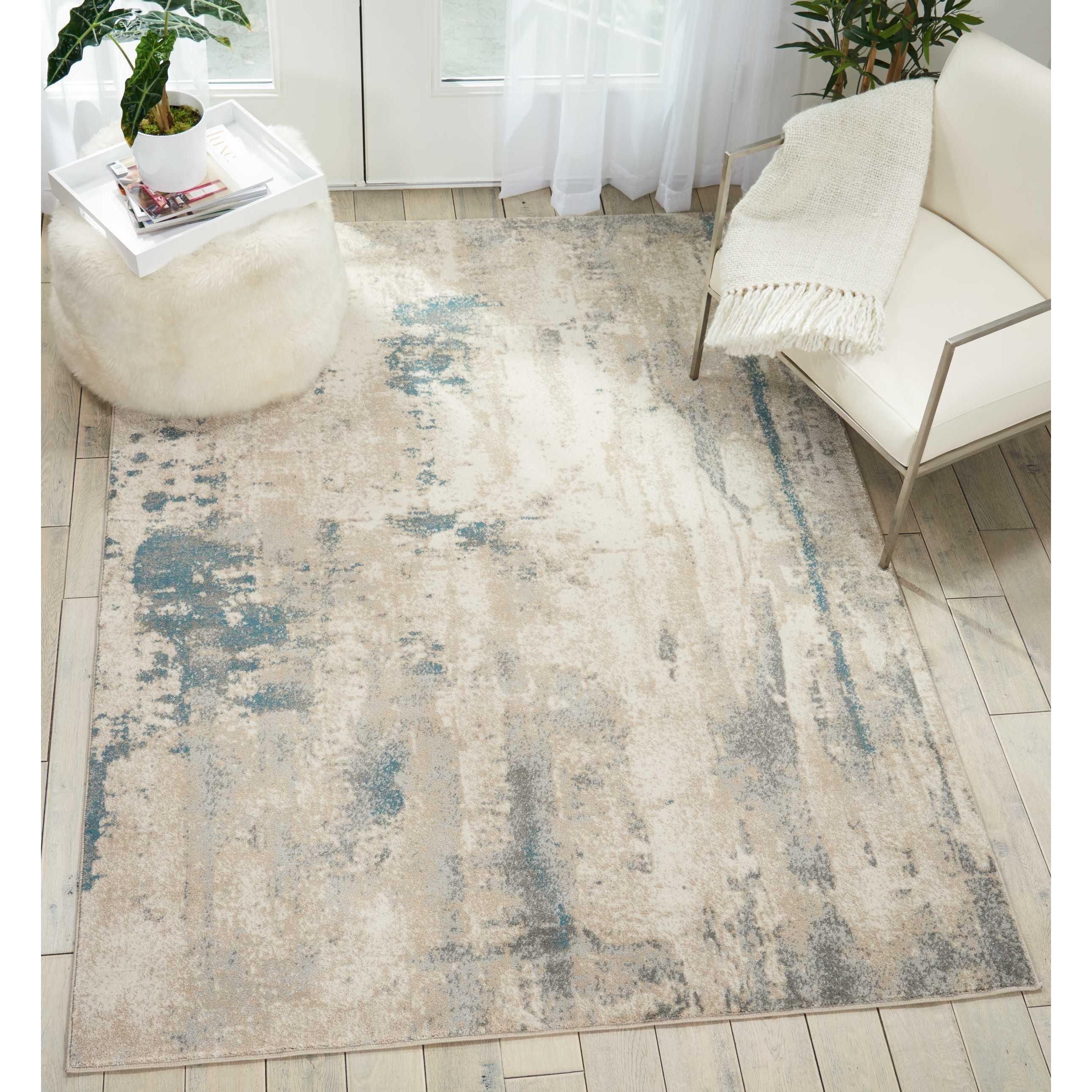 Maxell MAE17 Ivory Teal area rug from the Maxell Collection, a stunning piece that will elevate any space with its unique and dimensional appeal. This rug features gorgeous transitional shadings and ombre effects that create a captivating visual impact. The exciting abstract design adds a touch of imaginative intrigue to your room, while the versatile shades of smoky blue, grey, and ivory ensure it will complement any decor style effortlessly.